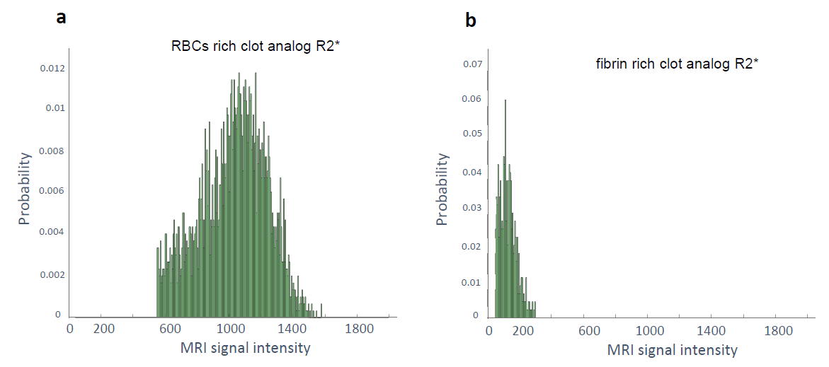 For this purpose, clot analogs with RBCs-rich and fibrin-rich compositions were prepared as previously described 7. The clots were imaged in triplicates, in fresh state and after fixation in formalin. The clots underwent 1H magnetic resonance imaging scans with a 7 Tesla/68 cm MR scanner (Siemens Medical Solutions, Erlangen, Germany), using 32-channel receive coil (NOVA Medical Inc., MA) with a single channel volume transmit coil. 3D T1-weighted MR images were acquired using MP2RAGE 8 (TE/TR = 3.37/5000 ms, TI1/TI2 = 800/2700 ms, α1/α2 = 4°/5°,0.6 mm isotropic resolution, bandwidth = 240 Hz/Px). 3D high resolution gradient-echo (GRE) images were acquired with two parameter settings (TE/TR= 10/15ms or 3.16/7.3ms, 0.3 mm isotropic resolution, FA = 4 °, bandwidth = 240 Hz/Px) to enhance the contrast for blood clot samples. Quantitative R2* maps were acquired with 3D multi-echo GRE sequence with monopolar readout (8 TEs ranging from 4.2 to 35.12ms, 0.75mm isotropic resolution, GRAPPA factor of 4, in-plane resolution = 0.7 mm, slice thickness = 0.8 mm, receiver bandwidth = 340 Hz/pixel, TR = 38 ms with no flow compensation, FA = 15 °) with the reconstruction method of Computationally Efficient Combination of Multi-channel Phase Data From Multi-echo Acquisitions (ASPIRE) 9. Clot segmentation was performed with 3D Slicer 10. Histograms representing the probability of signal intensity distribution were derived from clot segmentations with MATLAB.RESULTS