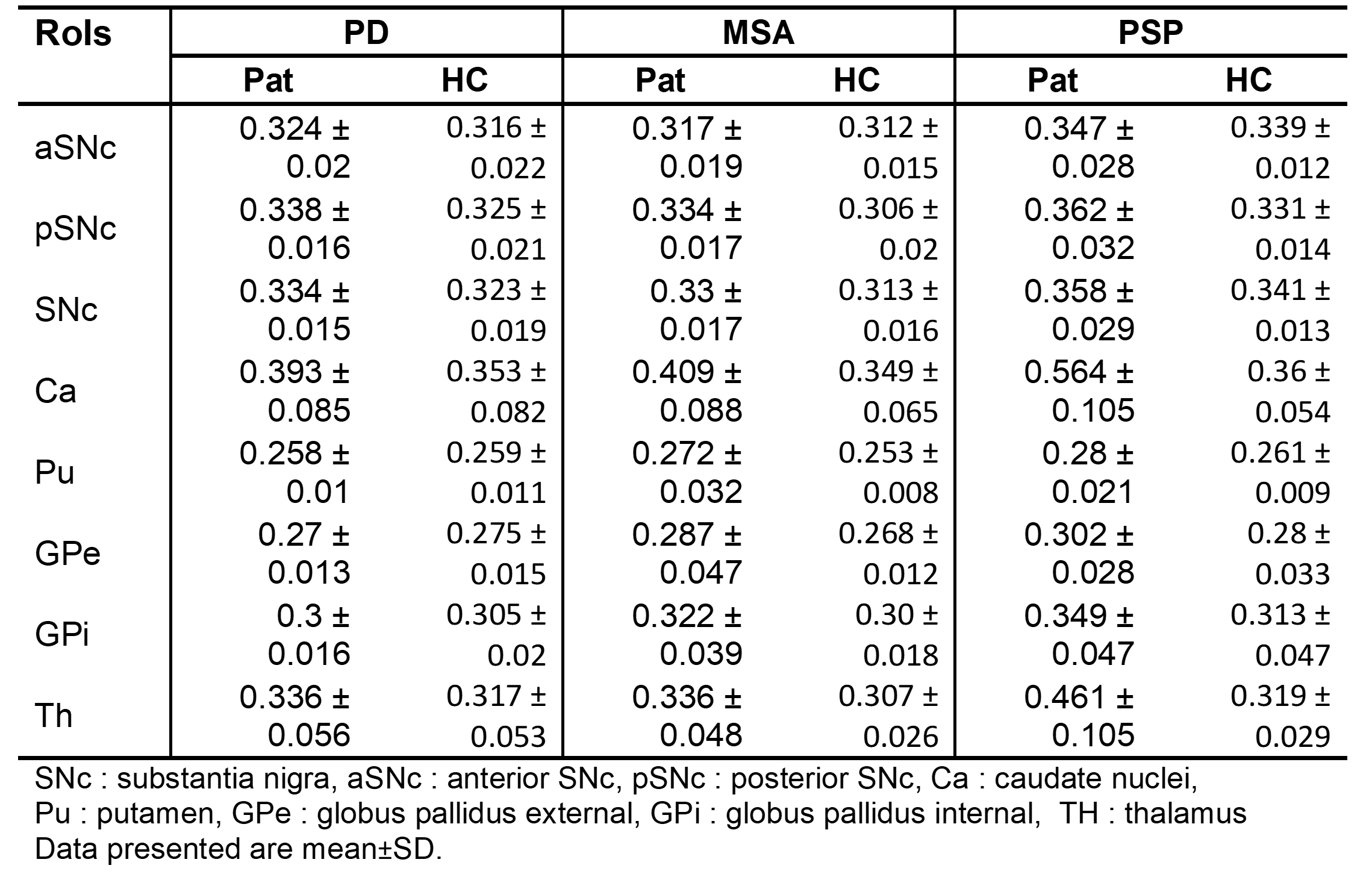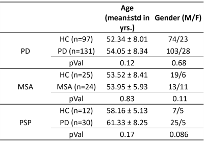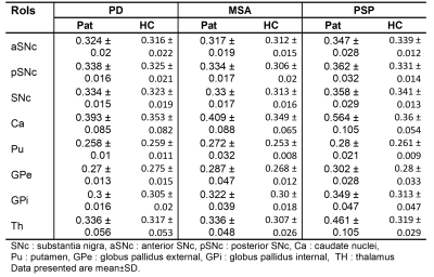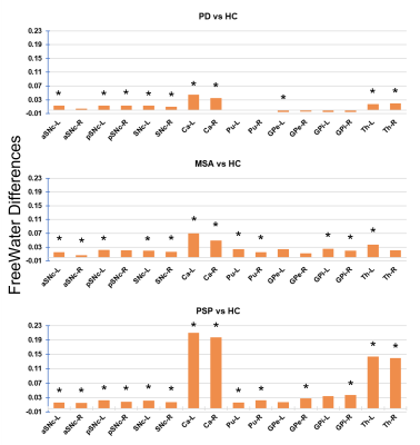 Parkinson's disease(PD), multiple system atrophy(MSA), and progressive supranuclear palsy(PSP) are neurodegenerative disorders with parkinsonism as a central feature. Although MSA and PSP are atypical parkinsonian disorders, they may be difficult to differentiate from PD particularly in the early stages. Multiple studies have demonstrated that patients with Parkinsonian disorders have higher freewater(FW) in the substantia-nigra-pars-compacta(SNc) and basal ganglia(BG), and FW was shown to reliably distinguish between these patients, making it a potential biomarker. Our investigation into the alterations of FW in PD and atypical parkinsonian disorders, we attempt to evaluate the alterations of freewater in the SNc and basal ganglia structures.1. Planetta, P.J., Ofori, E., Pasternak, O., Burciu, R.G., Shukla, P., DeSimone, J.C., Okun, M.S., McFarland, N.R. and Vaillancourt, D.E., 2016. Free-water imaging in Parkinson’s disease and atypical parkinsonism. Brain, 139(2), pp.495-508