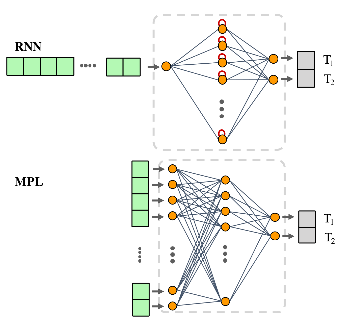 We defined two different architectures of the DL model: a multilayer perceptron (MLP) and a recurrent neural network (RNN) (Figure1). Both the models are used to perform a voxel-wise regression of the T1 and T2 parameters, given a MRF signal evolution trajectory as input. While MLPs are general purpose models for handling non-specific input data, RNNs are meant to deal with time-series signals to solve temporal problems. The MLP is composed of a sequence of fully connected layers. The input layer consists of a number of nodes equal to the MRF sequence length with a sigmoid activation function, while the output layer consists of 2 nodes for the prediction of T1 and T2 values. The RNN is composed of a long-short term memory (LSTM) block, followed by a fully connected layer with 2 nodes for the output predictions. The set of optimal hyperparameters of the model and the training algorithm were established through an optimization procedure and a k-fold cross validation method (Figure2) cycling on 5 slices of the first phantom. The hyperparameters that were tuned include the architecture of the model (MLP/RNN), model parameters and parameters of the training algorithm.