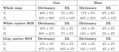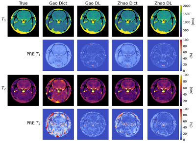 Gold standard T1 and T2 maps, the dictionary-based reconstructed maps and the DL-reconstructed maps are represented in Figure3 for both the G-MRF and Z-MRF datasets. Firstly, we can qualitatively see that the estimated parametric maps of both the methods have correctly reconstructed the anatomical structures of the brain, preserving the visual contrast between different tissues. We can also observe that the range of T1 and T2 maps estimated with all the MRFingerprinting techniques are comparable with the reference T1 and T2 maps. Figure3 shows the error map associated with each parameter computed voxel-wise as the Percentage Relative Error (PRE). The complete list of the PRE mean values and SD are shown in the table of Figure4.