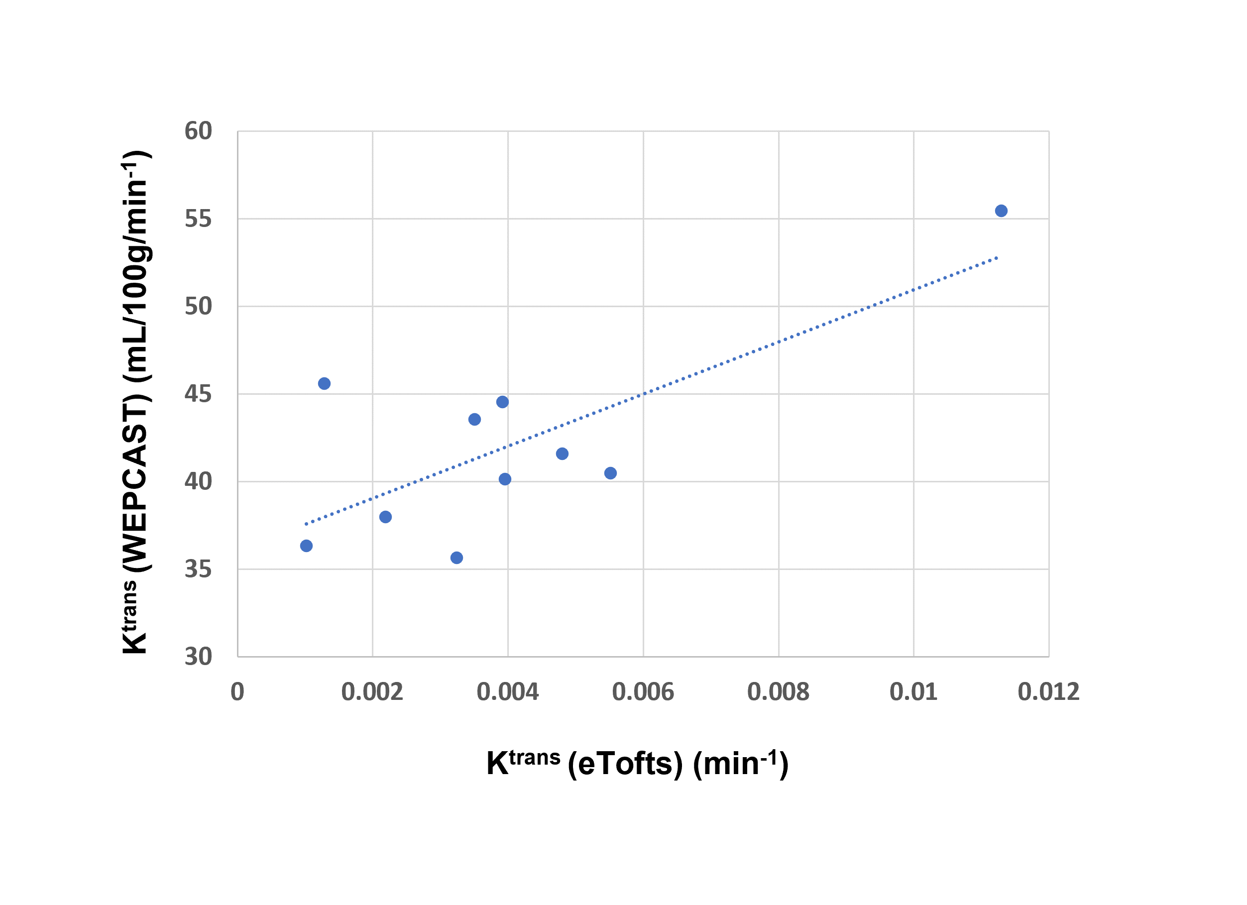 In conclusion, global volume transfer constant (Ktrans) computed from WEPCAST as well as from DCE-MRI data (whole brain fontal gray matter) exhibit good correlation.Acknowledgements