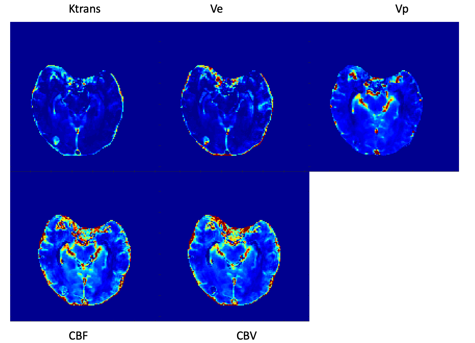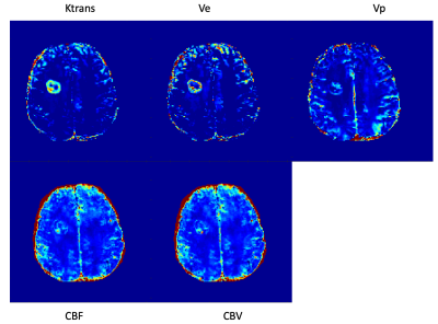 Brain tumors tend to impact blood brain barrier (BBB) integrity, angiogenesis, and vascularity1. Therefore, on the basis of conventional MRI, permeability and perfusion MRI sequences could provide additional important information on diagnosis, treatment response, and survival prediction. Currently, dynamic contrast-enhanced (DCE) MRI is widely used to quantify BBB permeability-related properties, such as transfer constant (Ktrans), fractional plasma volume (vp), and fractional extravascular-extracellular volume (ve), and dynamic susceptibility contrast MRI (DSC) is used to quantify perfusion-related properties, such as cerebral blood volume (CBV) and cerebral blood flow (CBF). We recently developed an MR multitasking-based dynamic imaging for cerebrovascular evaluation (MT-DICE) technique for simultaneous quantification of permeability and leakage-insensitive perfusion with single-dose contrast injection2. In this work, we conducted a clinical study to assess the real-world performance of MT-DICE in patients with brain tumors.Methods