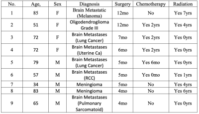 Nine patients (aged 34–85 y, 4 females) with known brain tumors were recruited with informed consent, including one patient with oligodendroglioma (Grade III), two patients with meningioma, and six patients with brain metastases. All subjects had received radiation therapy (0.2-7 years).