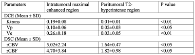 As shown in Figure 2, all the quantitative parameters from DCE and DSC were significantly higher in the contrast-enhanced area than in the peritumoral T2 hyperintense area (p < 0.01).
