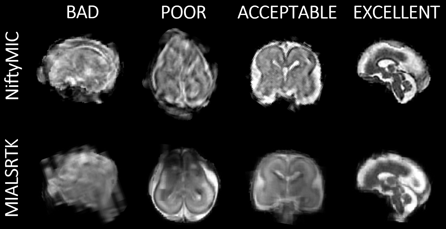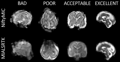 Forty fetal brain volumes were reconstructed via NiftyMIC and MIALSRTK. Seven reconstructed fetal brains were rated as bad and were discarded.