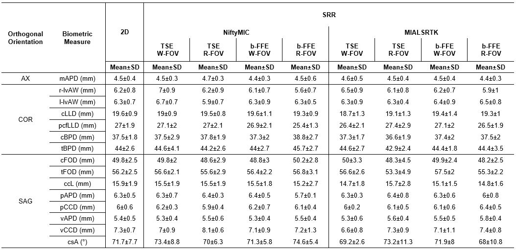 The estimated biometric measurements percentage error showed an average error rate of 0.3% ± 4.9% and -0.4% ± 4.8% for NiftyMIC-TSE and b-FFE reconstructions, respectively; -0.75% ± 5.37% and -0.61% ± 4.8% for MIALSRTK-TSE and b-FFE reconstructions, respectively. The percentage error of different measurements was significantly different from 0 for ccL in b-FFE and vCCD in TSE reconstructions via NiftyMIC; for cLLD in b-FFE and TSE, and vCCD in TSE reconstructions via MIALSRTK.