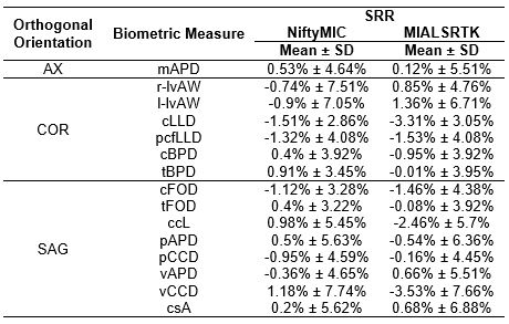 Results of the estimated biometric measurements percentage error (Table 2) showed an overall average error rate of -0.1% ± 4.9% and -0.7% ± 5.1% for NiftyMIC and MIALSRTK, respectively.