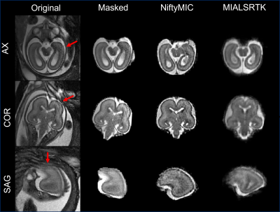 The reconstruction reliability of both tools was assessed as Moderate to Good12 (averaged ICC with 95% CI was 0.82 [0.62-0.92] for NiftyMIC, and 0.79 [0.57-0.90] for MIALSRTK).