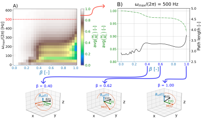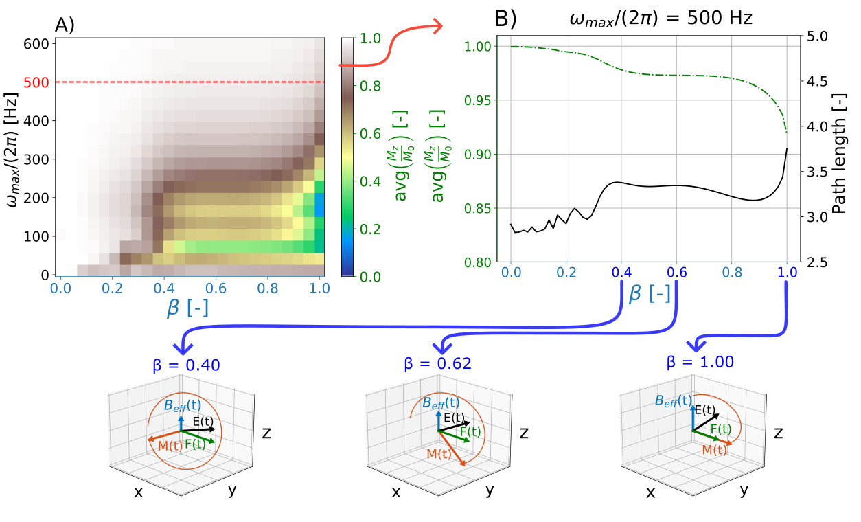 Simulation shows increased averaged Mz for increasing peak frequency with the yaRAFF-pulse (Fig2A). At 500Hz (maximum allowed frequency), the averaged Mz showed an increasing trend for smaller β, while the magnetization path length decreased. The optimal β=0.62 resulted in higher performance (0.973) compared with RAFF (0.919) (Fig2B).