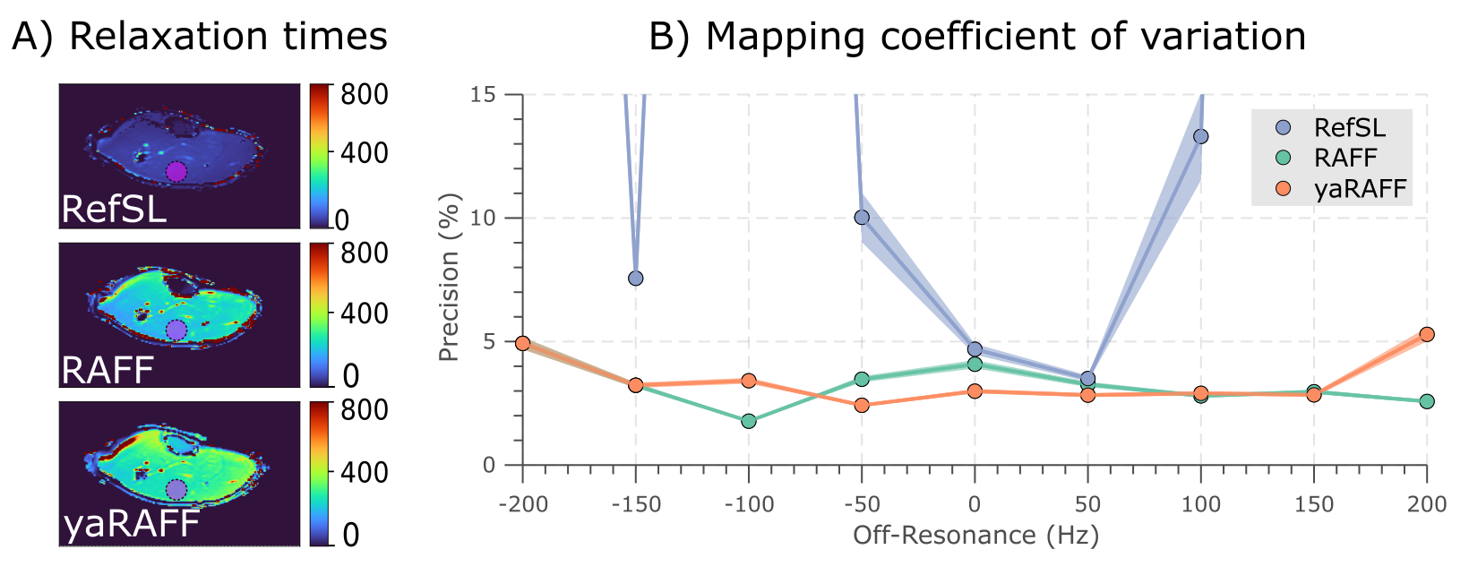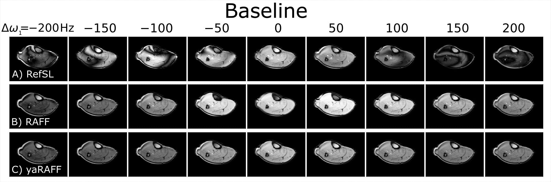 In-vivo magnitude baseline images acquired in one healthy subject are shown in Fig4 for RefSL, RAFF, and yaRAFF at nine off-resonances (Δω1=±200Hz). RefSL shows poor resilience against off-resonance artifacts (Fig4A). Across several off-resonances yaRAFF achieves more homogeneous signal intensities compared with RAFF (Fig4B-C). For quantitative mapping, RefSL shows poor precision in the presence of off-resonances with a CoV>15%, while RAFF and yaRAFF yield substantially improved off-resonance resilience, with an average CoV of 3.1% and 2.9%, respectively (Fig5).Discussion