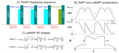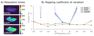 Mapping was performed at 3T (Philips Ingenia) acquiring 4 TRAFF-prepared bSSFP images (max RF power=13.5μT, pulse duration=2.84ms, preparation duration=0,28,57,85ms) and a saturation image (Fig1A). All scans shared the following imaging parameters: resolution=2x2mm2, slice-thickness=8mm, FOV=181x181mm2, flip-angle=700, TE/TR=0.83/2.05ms. Maps were obtained by fitting a three-parameter model. The coefficient of variation (CoV) within manually-drawn ROIs was used to assess precision (Fig5).Results