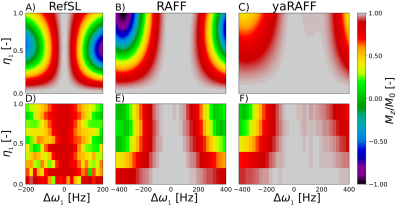 The implemented yaRAFF had an alternation in the frequency modulation function, leading to a slight off-center frequency shift. Thus, Increased resilience against positive off-resonance compared with negative off-resonance is observed. Consequently, for in vivo application, the pulse is best played at a positive off-resonance shift, to center the off-resonance tolerance.