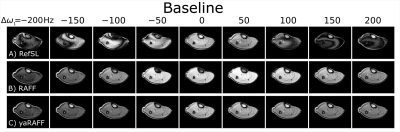 In simulations, the FWHM of the off-resonance response was 320±8, 448±8, and 668±8Hz, for RefSL, RAFF, and yaRAFF, respectively. Phantom experiments show close agreement with the simulations (Fig3), yielding an off-resonance FWHM of 240±20, 500±25, and 700±50 Hz for RefSL, RAFF, and yaRAFF, respectively.