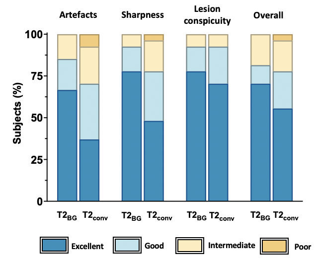 35 patients (51±16 years; 12 female) were included. T2BG showed significantly less artefacts (4.5±0.7 vs.4.0±0.9, P<0.001) and better sharpness (4.7±0.6, P=0.003) compared to T2conv. Overall image quality (4.5±0.8 vs. 4.3±0.9, P=0.062) and lesion conspicuity (4.7±0.6 vs. 4.6±0.6, P=0.5) were similar for both T2BG and T2conv. T2BG had significantly longer TR (3608±667ms vs. 2244±384ms; P<0001). Sequence scan time was shorter with T2BG (4.1±1.2min vs. 5.2±1.2min; P=0.041), with a reduction of scan time by 21%. SNR (70.2±40.7 vs. 67.1±36.2, P=0.624) and CNR (68.2±40.4 vs. 65.2±35.9, P=0.623) were similar for both imaging approaches.Discussion