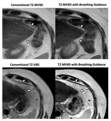 Liver disease is a global burden with a growing incidence and prevalence1. Recent improvements in MRI techniques allow for non-invasive comprehensive assessment and monitoring of liver disease2. However, breathing artifacts are frequent in liver MRI and can lead to impaired image quality, decreased diagnostic confidence, and as a consequence, longer scanning times3. This is of clinical importance, especially in patients with irregular breathing patterns, comorbidities, and anxiety. Therefore, this study aimed to evaluate the image quality of a standard T2w sequence with propeller acquisition (MultiVaneXD) using a newly developed in-bore breathing guidance (T2BG) application in comparison to a conventional free-breathing acquisition (T2conv). Breathing guidance software was developed to improve the scan efficiency, image quality, and patient experience by guiding patients` breathing in a personalized, adaptive manner to a predefined target pattern during MRI examination.