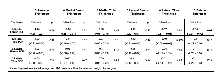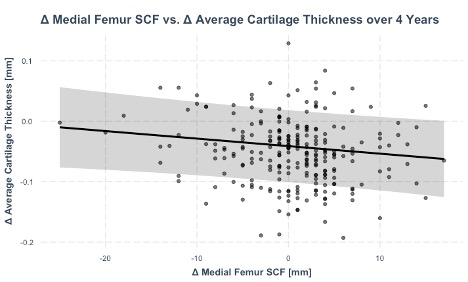 There were no significant differences (p>0.05) in age, BMI, sex, and KL grade between the weight gain, weight loss, and control groups at baseline. Individuals who gained weight over 4-years had significantly greater increases in joint-adjacent SCF (beta range, medial/lateral joint sides: 2.2mm to 4.2mm, p<0.001) than controls after 4 years, while individuals who lost weight had significantly greater decreases in joint-adjacent SCF than controls (beta range: -1.4mm- -3.9mm, p<0.001, Table 1). No statistically significant (p>0.05) associations were found between weight change and cartilage thickness change over 4 years. However, increases in joint-adjacent SCF over 4-years were significantly associated with decreases in cartilage thickness (1 SD increase in medial femur SCF was associated with 0.14 SD decrease in average in thickness, p=0.04), Figure 1 and Table 2. In addition to average cartilage thickness, increases in medial femur SCF were associated with decreases in medial femur cartilage thickness (coeff_standardized.=-1.5, p=0.03), lateral tibia thickness (coeff_standardized.=-0.17, p=0.01), and patella thickness (coeff_standardized.=-0.14, p=0.04).Conclusion: