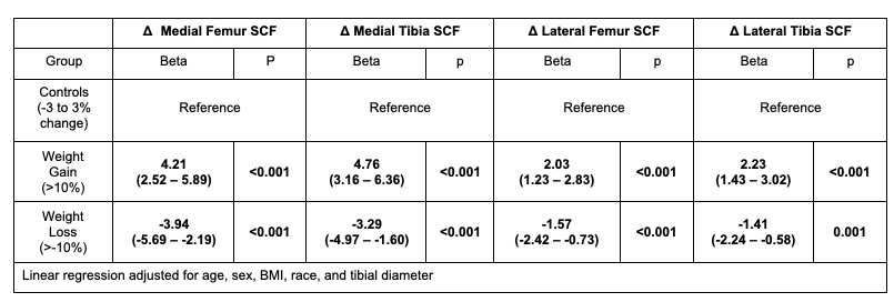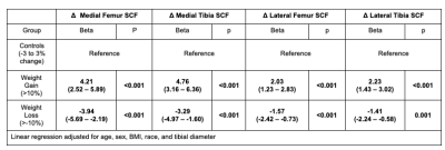 A total of 399 Individuals from the Osteoarthritis Initiative (OAI) with >10% weight gain (n=100) and >10% weight loss (n=100) over 4 years were compared to an age, gender, BMI, Kellgren-Lawrence (KL) grade-matched control cohort with less than 3% change in weight (n=199). MR imaging was performed using 3T MRI scanners (Trio, Siemens, Erlangen, Germany) at four centers as part of the imaging OAI protocol at baseline and after 4 years. The following sequences of the right knee were analyzed in this study: 1) coronal 3D fast low angle shot with water excitation (FLASH WE) [7.57 ms/20 ms; 0.313 mm × 0.313 mm; 160 mm; 1.5 mm; 0 mm] and 2) sagittal 3D dual-echo steady state sequence with water excitation (DESS WE) [4.7 ms/16.3 ms; 0.365 mm × 0.456 mm; 140 mm; 1.5 mm; 0 mm] with axial and coronal reformations. Joint-adjacent SCF was measured on coronal 3D FLASH WE MRI sequence at four locations on the medial and lateral sides of the knee joint (Figure 1) at baseline and 4-year follow-up. Cartilage thickness was measured on the 3D DESS sequence using a fully-automatic, deep learning method that has been previously developed and validated by our group4. Cartilage thickness was quantified in five knee regions (medial/lateral tibia and medial/lateral femur and patella, and the average thickness in all regions) at baseline and 4-year follow-up. Changes in SCF and cartilage thickness, respectively, were defined by subtracting the baseline measurement from the 4-year follow-up measurement. Linear regression models were used to evaluate the associations between (1) weight change group and 4-year changes in both knee SCF and cartilage thickness and (2) 4-year changes in knee SCF and 4-year changes in cartilage thickness. For analysis (2), the beta coefficients represent the standard deviation change of the outcome, per standard deviation change of the predictor. All analyses were adjusted for age, sex, BMI, and tibial diameter (and weight change group in analysis (2)). Results: