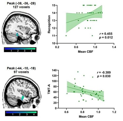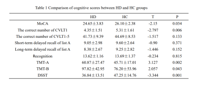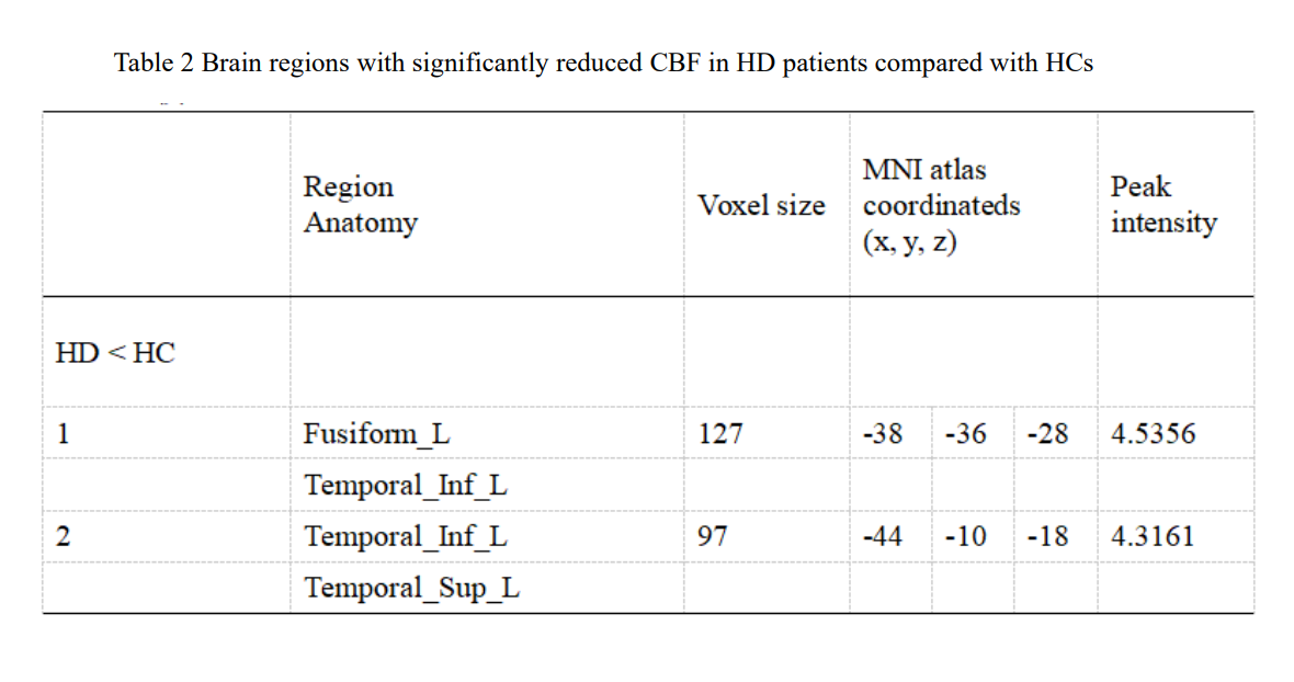 There were statistical differences in MoCA score, correct number of free recall in CVLT1 experiment, TMT-A, TMT-B and DSST between the two groups (p < 0.05) (Table 1). The CBF value was significantly reduced in brain regions of the left Fusiform (Fusiform-L) and the left Temporal Inferior (Temporal Inf – L) in the HD group compared with the HC group. The voxels, MNI coordinates, and peak intensity for these regions are shown in Table 2. Mean CBF in Fusiform -L was positively correlated with cognition (r = 0. 455, p = 0.012), and mean CBF in Temporal Inf - L was negatively correlated with TMT-A (r = -0.389, p = 0.030) (Figure 2).Discussion
