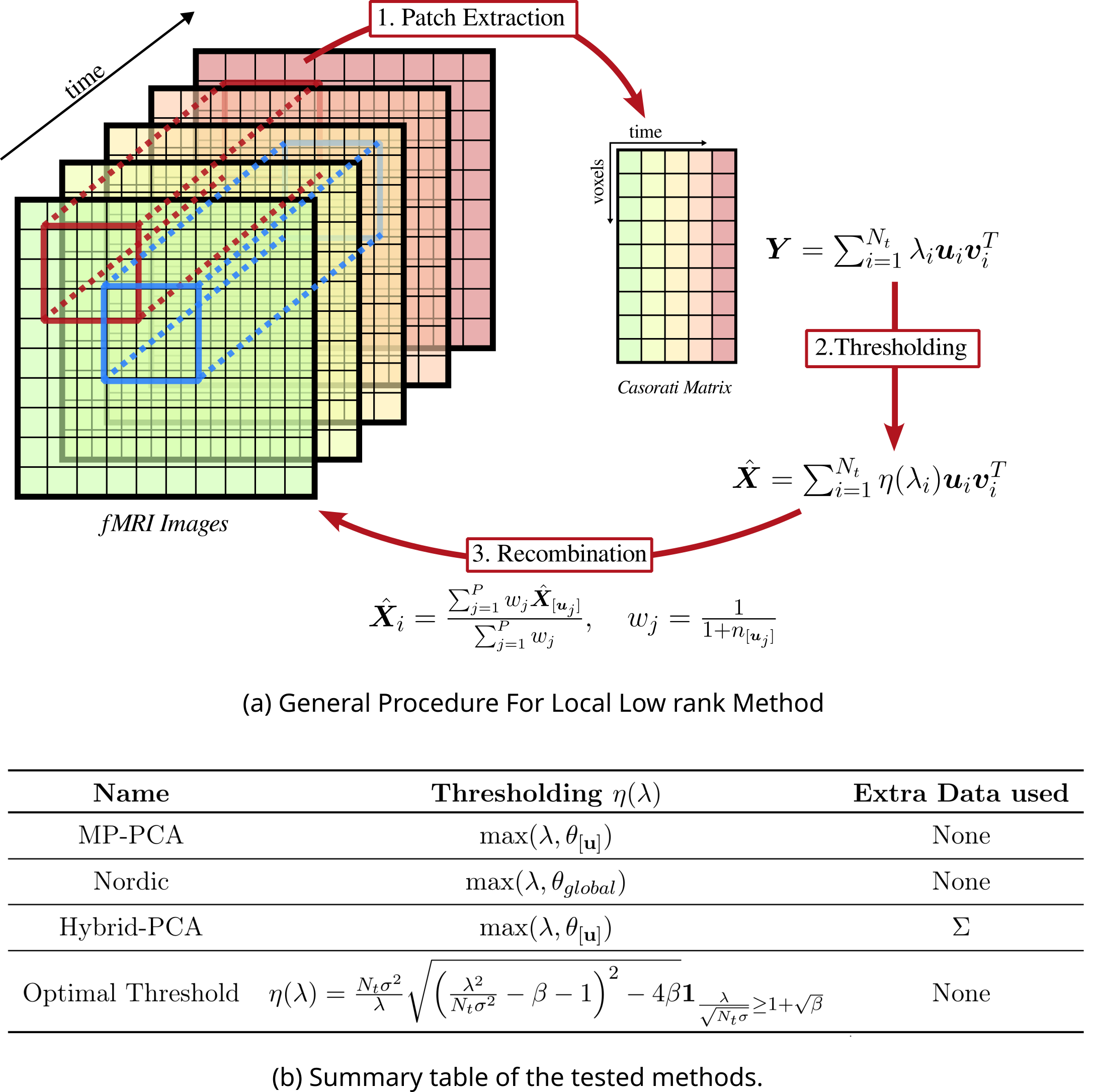 FMRI scans are inherently low rank as we observe small variations of the BOLD signal over a constant background. Thus it can be considered as a noisy observation of a low rank matrix $$$~\mathbf{Y}_{ij}=\mathbf{X}_{ij}+\mathbf{N}_{ij}~$$$where the noise components are independent and Gaussian $$$~\mathbf{N}_{ij}\sim\mathcal{N}(0,\mathbf{\Sigma}^{2})$$$.