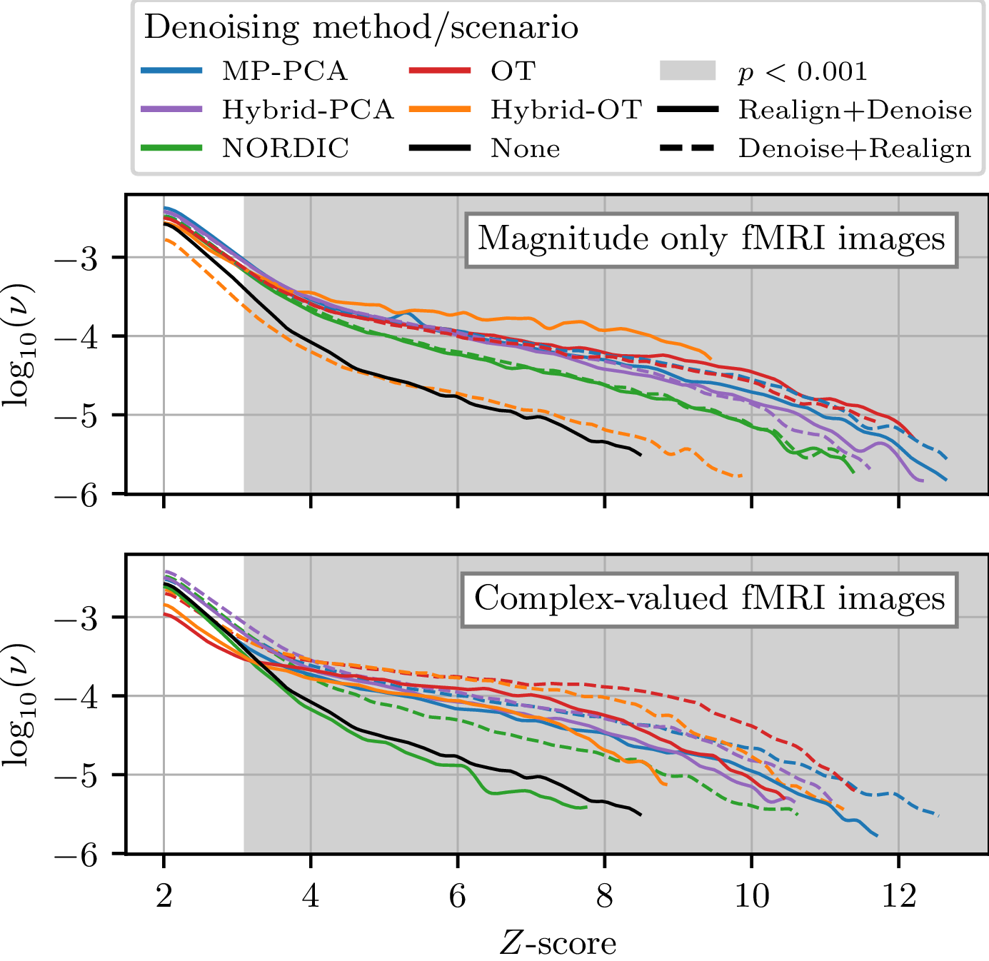 Figure 5 reports average gain in activation over 6 subjects, positive in most cases. Performing the denoising prior to realignment is most beneficial, especially when focusing on the occipital ROI. Our interpretation is the following: even though the realignment step aims at producing lower-rank fMRI images by removing part of the physiological noise, it also resamples the images, and potentially affect the noise behavior.Conclusion