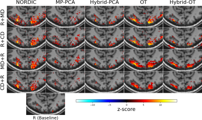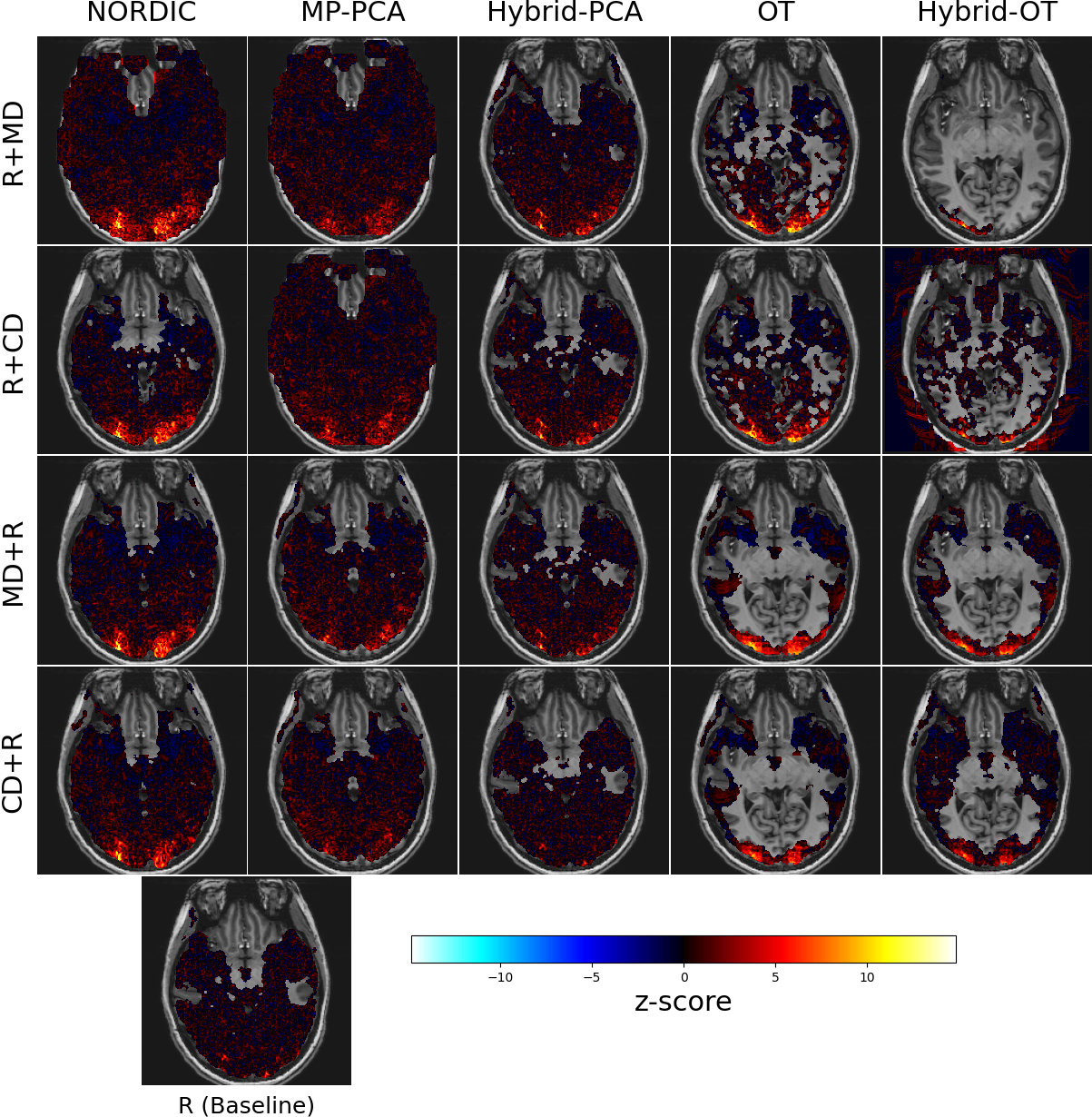 Figure 2 compares z-scores related to global effect of interest for a single subject. Denosing brings higher z-score in complex-valued or magnitude-only images. For the same subject, Figure 3 and 4 shows the denoised z-score maps for the 20 tested configuration and noisy baseline and the thresholded activations map respectively. OT method shows better performance than other methods, detecting activations only in gray matter, and yields highest z-score with largest spatial extend in occipital region, especially when doing magnitude-only denoising before realignment (scenario OT/MD+R It provides the best sensitivity/specificity trade-off.