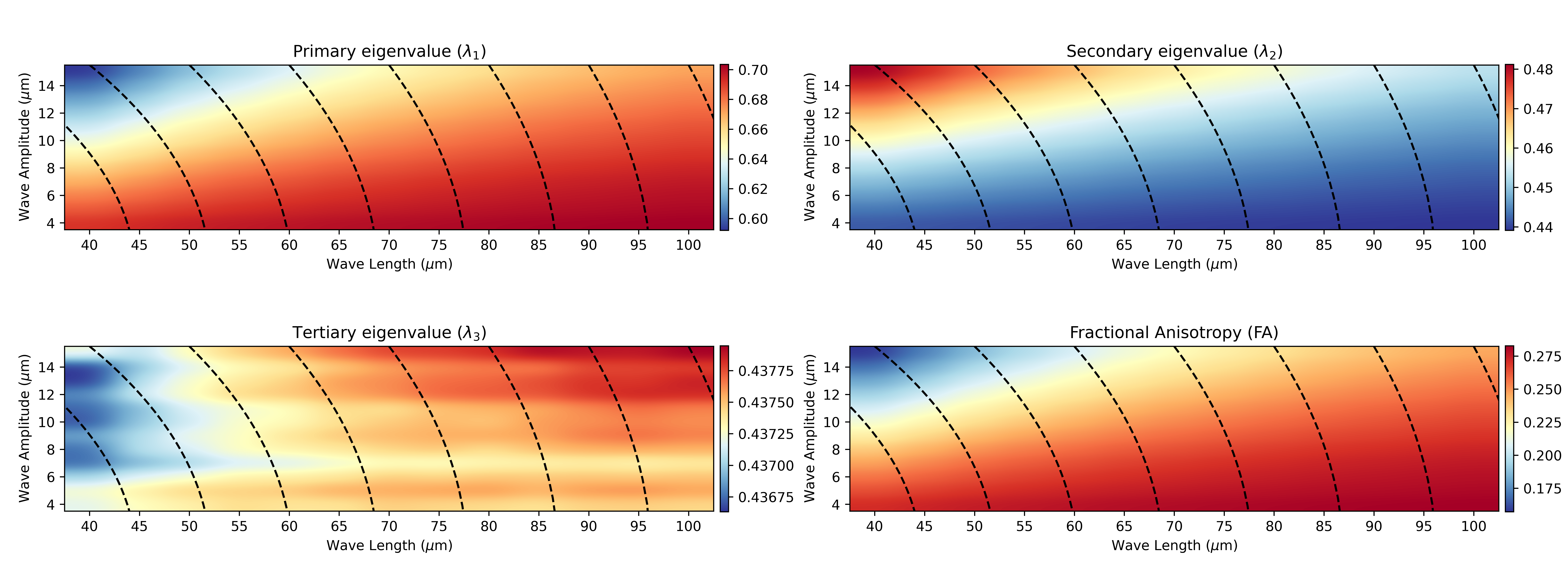 To explore this effect, we fixed the fiber diameter and spacing to the median value measured in Table 1 and spanned a range of crimp amplitudes and wavelengths (Fig. 3). If collagen elasticity is ignored, a deforming fiber will reduce its level of crimp during stretching while maintaining a constant fiber length. If this stretch is proportional to the change in the crimp wavelength, then the crimp amplitude can be computed. Figure 4 considers how a fiber deforming in this way will influence the DTI metrics. Changes in λ1 and FA are observed while λ2 has only a slight change and λ3 is insensitive to the change.Discussion and Conclusion