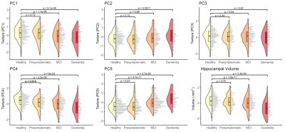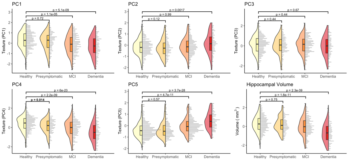 Analysis 1) We identified a novel difference in one component of texture (PC4) at the earliest stage of AD, between healthy (Aβ-) and presymptomatic (Aβ+) older adults (Cohen’s d=0.23, padj=.014). Differences in other components of texture, and hippocampal volume, emerged later in the disease continuum alongside the onset of cognitive impairment (d=0.30-1.22, padj<.002) (Figure 1).