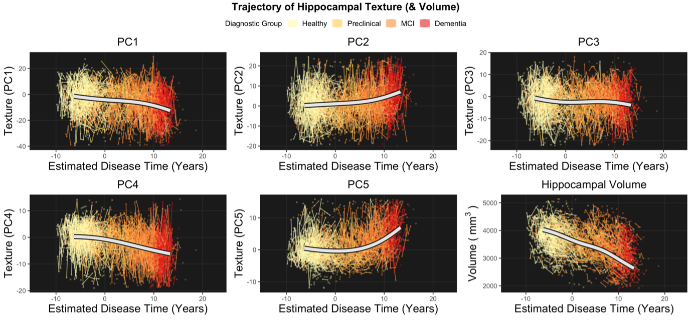 Our cross-sectional analyses (Analysis 1) revealed a temporal ordering in which markers of brain structure become abnormal relative to healthy ageing. Texture PC4 was different at the presymptomatic stage of Alzheimer’s disease. This component therefore appears to be sensitive to the very earliest stages of pathology and may represent the best chance of detecting microstructural damage to extant tissue in AD before the onset of cognitive impairment. We find that hippocampal volume is only reliably different from healthy adults after the onset of mild cognitive impairment.