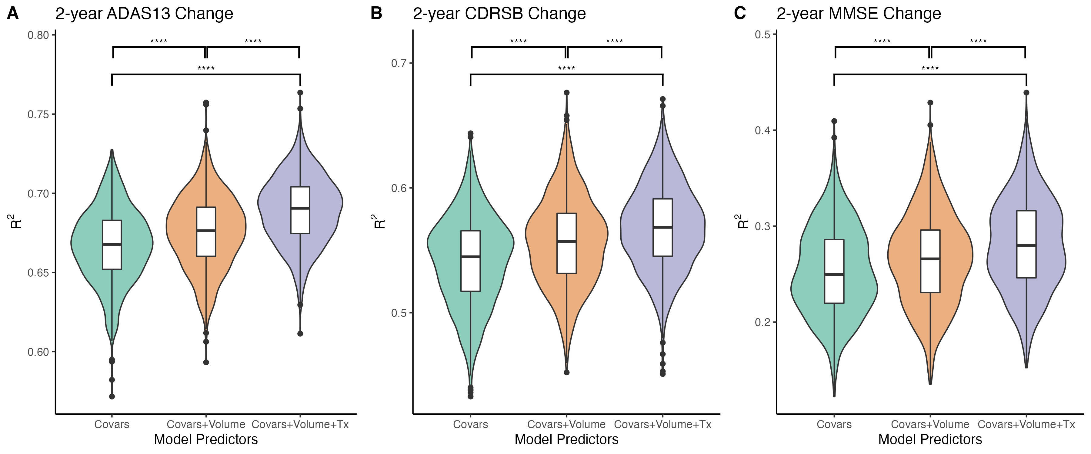Analysis 3) In order to investigate if hippocampal texture provides additional useful information on top of that provided by volume to predict cognitive decline, we compared the variance explained (R2) by three sets of three linear regression models predicting future cognitive ability (over 2 years) in people without a diagnosis of dementia at baseline.Results