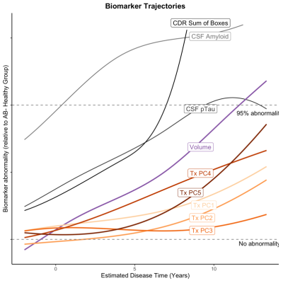 Analysis 2) To assess longitudinal texture change across the AD continuum we used a novel approach to estimate a ‘disease time’ along which participant timepoints could be staged. This method is based on a previously described and validated approach.9 We simultaneously modelled the multivariate trajectory of the amyloid Centiloid score (PET) and three cognitive test scores: Alzheimer’s Disease Assessment Scale (13-item version; ADAS13), Clinical Dementia Rating Scale Sum of Boxes (CDR-SB) and Mini-Mental State Examination (MMSE) to place each subject on a common time scale. Disease progression was modeled with a nonlinear mixed-effects model that jointly described the trajectories of the outcome measures. The estimated disease time was used as a scale on which to compare trajectories of various biomarkers, including volume and texture of the hippocampus. Trajectories were modelled in a subset of the data: Healthy (CN, Aβ-): n=345; Presymptomatic (CN, Aβ+): n=173; MCI (Aβ+): n=301; Dementia (Aβ+): n=161.