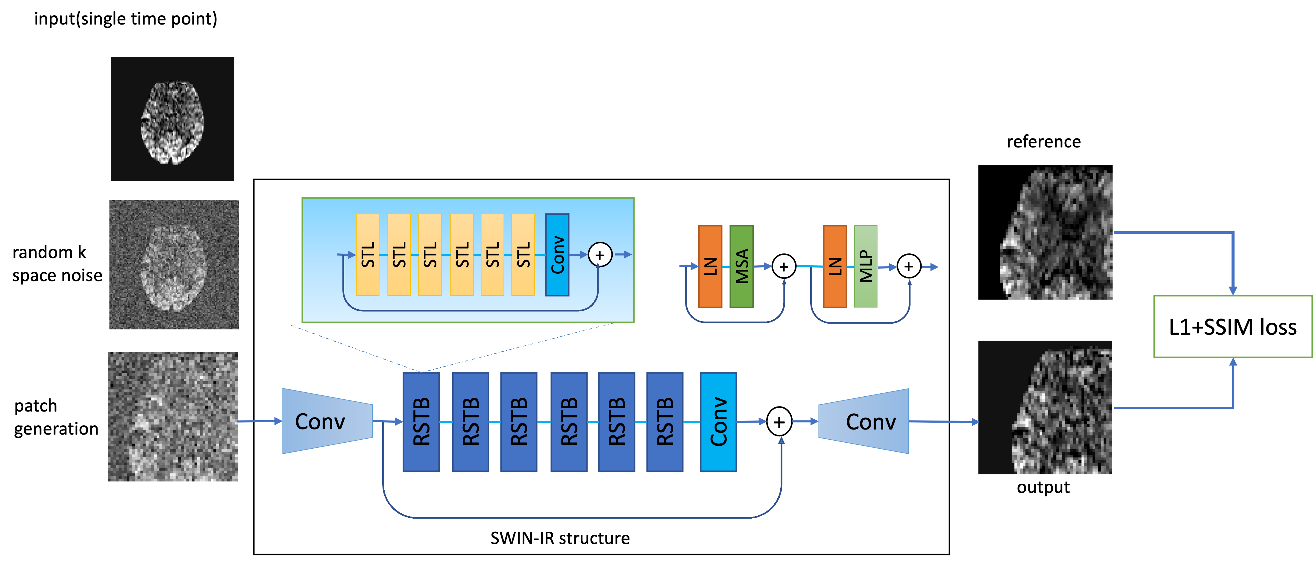 The training framework is shown in Figure 1. We utilized a transformer-based network called SWIN-IR4, which uses shifted window to improve the performance of regular vision transformer and has shown to have superior performance than CNN-based networks5. Random k-space Gaussian white noise was added to simulate for different SNR conditions. A 48×48 paired patch was generated for each input image during each iteration. The loss function used for the training was L1+SSIM to preserve both whole image similarity and sharpness.