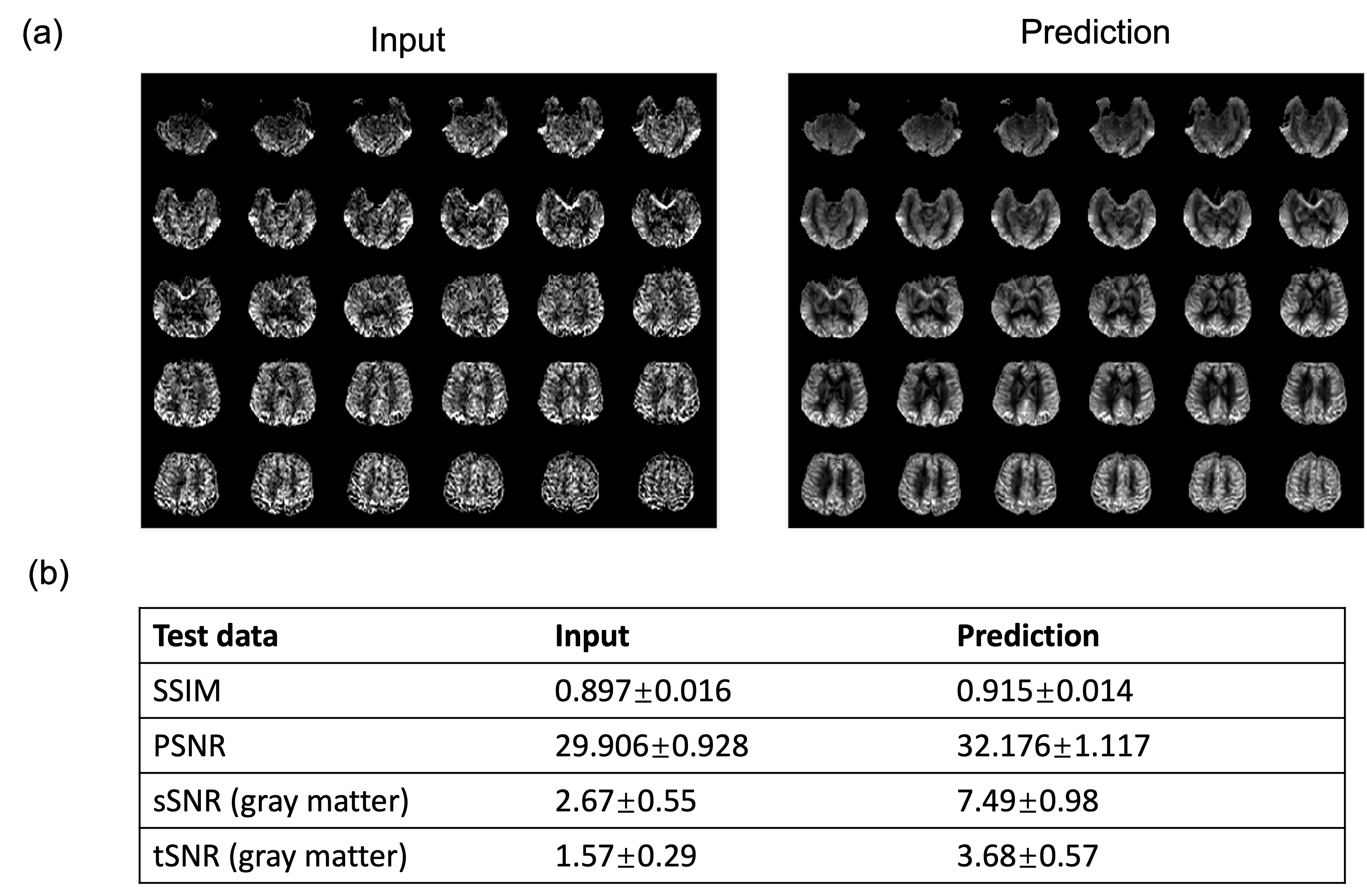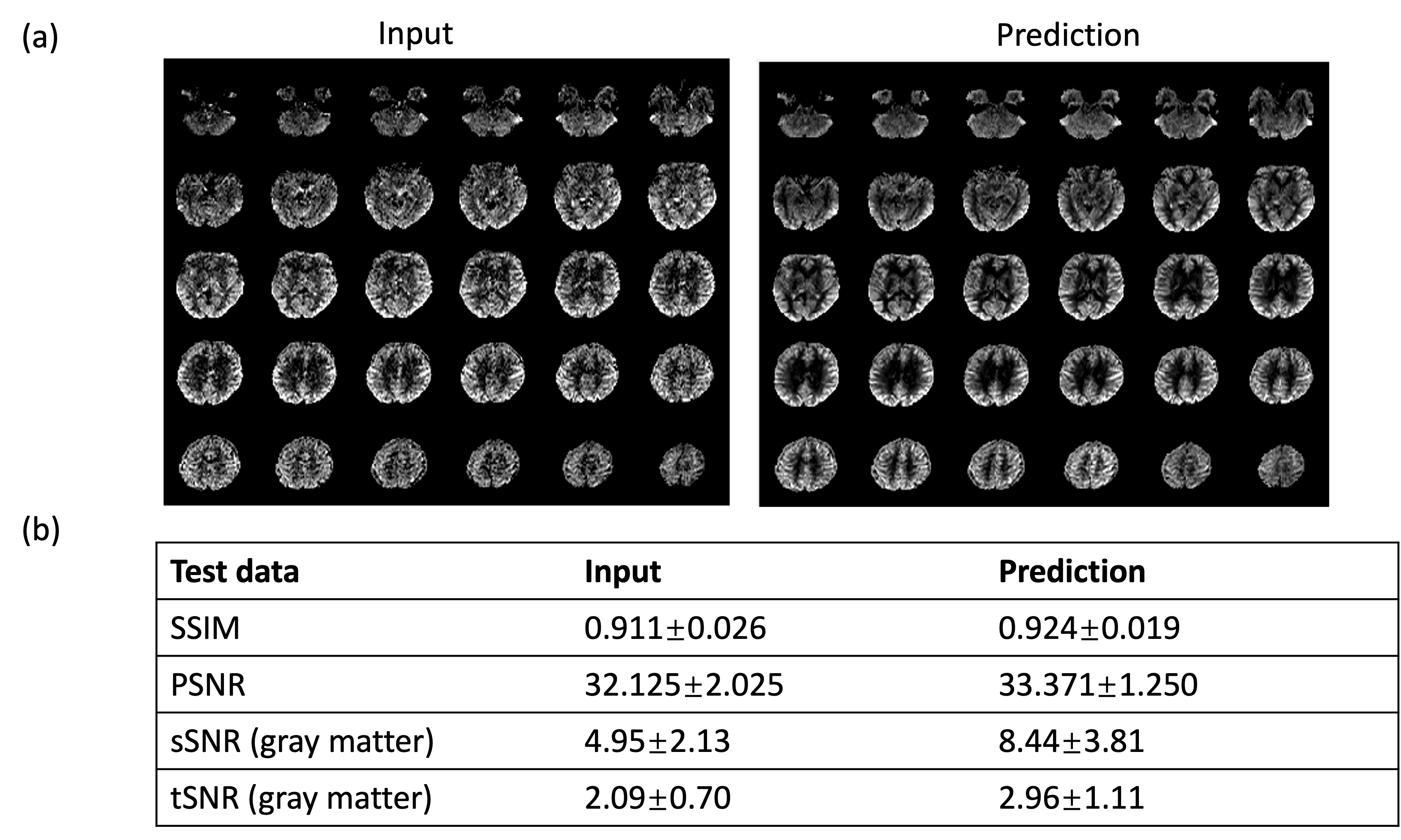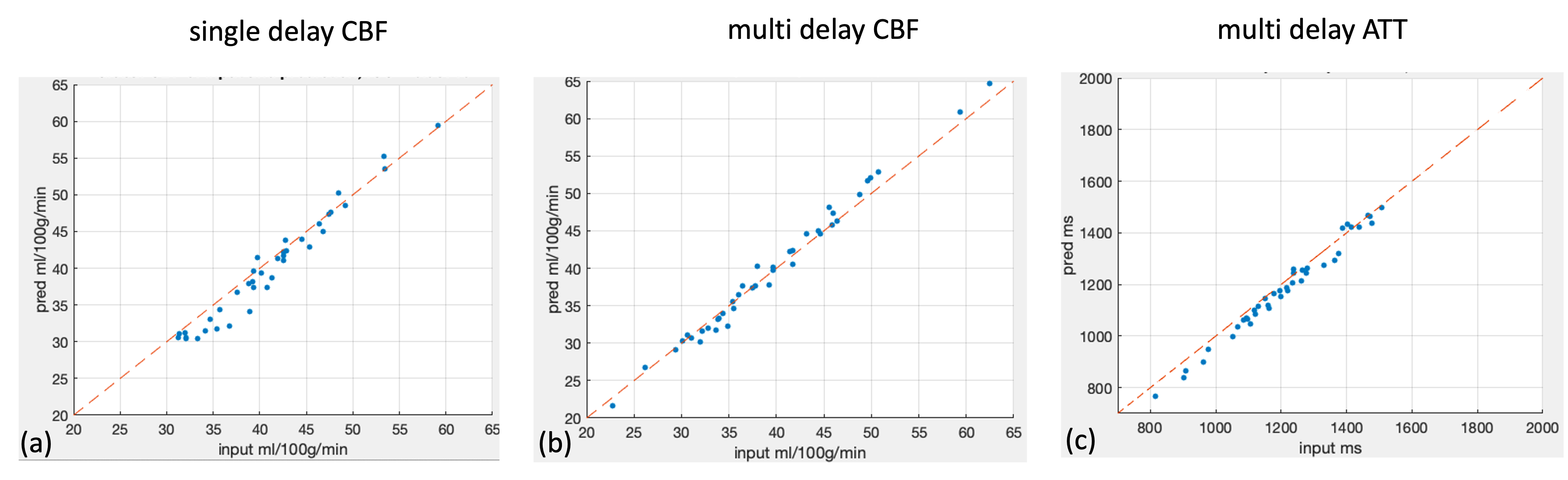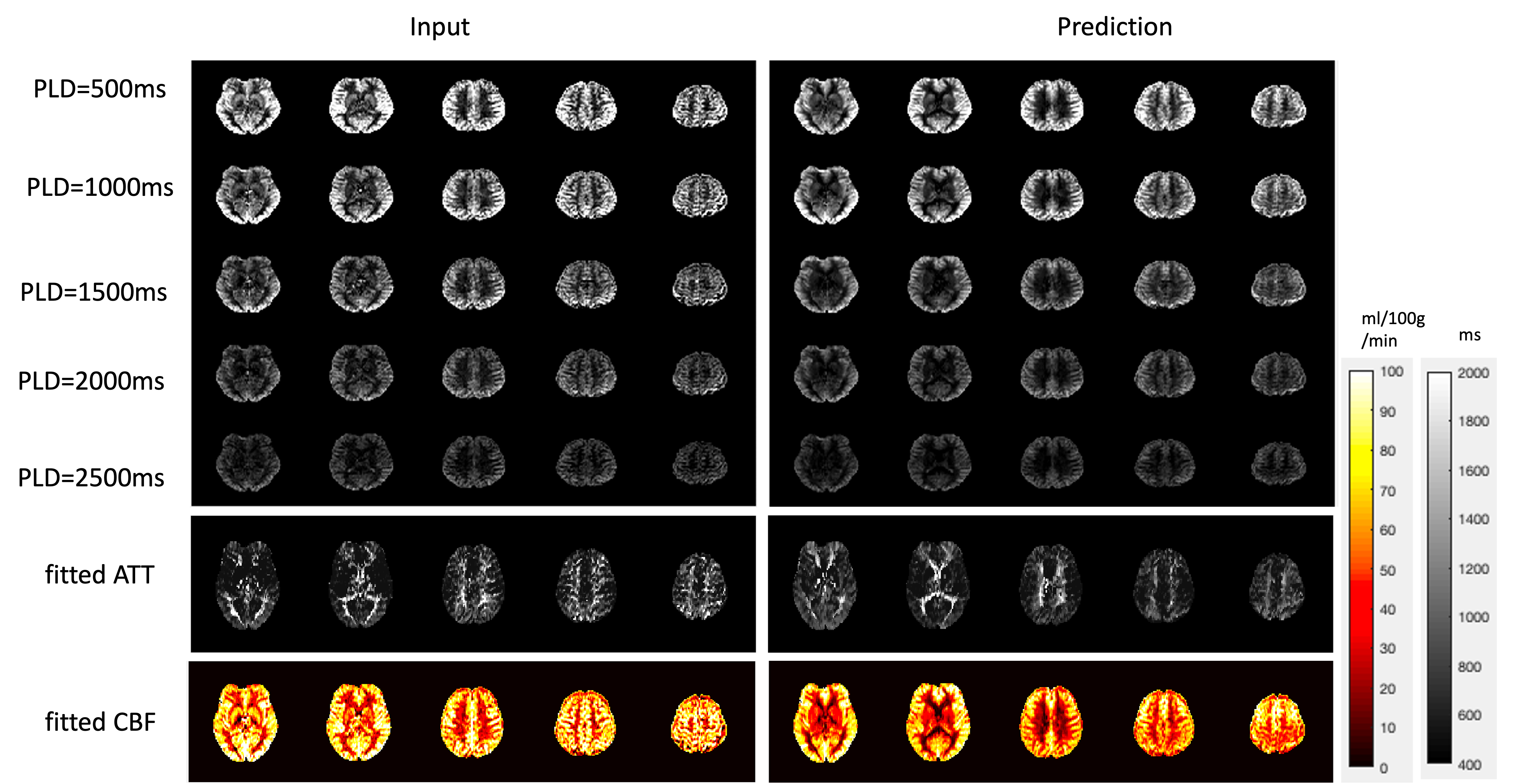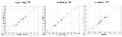 Figure 2 shows the results for the first test dataset, the image for the DL prediction has improved SNR compared to the input. The similarities metrics are also consistent with the visual quality, SSIM and PSNR after DL denoising were improved by 2% and 7.6%, while spatial and temporal SNR were improved by 181% and 134% respectively. Figure 3 shows the results for the second dataset, SSIM and PSNR were improved by 1.4% and 3.9%, while spatial and temporal SNR were improved by 71% and 42% respectively. Figure 4 shows the results for the multi-delay dataset. DL prediction has improved the SNR for perfusion images at each PLD, and improved SNR for the fitted CBF and ATT maps. Figure 5a shows that the global CBF values calculated from the DL prediction is highly consistent with those from the single-delay input images. Figure 5b and 5c show that the fitted CBF and ATT values from the DL predicted multi-delay perfusion images are also consistent with those fitted from the input images. Discussion and conclusion