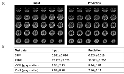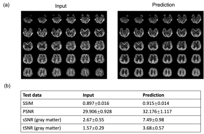 The model performance was evaluated on three different datasets. First was a separate test dataset with the identical imaging protocol as the training dataset (2 subjects with 672 slices). The second was acquired with a different protocol with a labeling duration of 1.8s, PLD of 2s and resolution of 2.5×2.5×3 mm3 (20 subjects with test-retest scans and a total of 1610 slices). The third was a multi-delay dataset with a labeling duration of 1.8s and 5 PLDs (0.5, 1, 1.5, 2, 2.5s) (same subjects as the second dataset). The latter two datasets were also acquired on the 3T Siemens Prisma scanner. For the first two datasets, reference images were calculated by averaging all acquired time points, and similarity measurements (peak signal-to-noise ratio (PSNR) and structural similarity index (SSIM)) were calculated from the prediction and reference. Besides, spatial SNR was calculated within the gray matter according to the definition in6, and temporal SNR was calculated by mean perfusion signal divided by standard deviation across time points. For the multi-delay dataset, since no reference image can be used, we compared the visual quality of perfusion images of each PLD and compared the fitted CBF and ATT maps from both the input 5 PLDs and the predicted ones to see if there’s any systematic bias for model prediction. Results