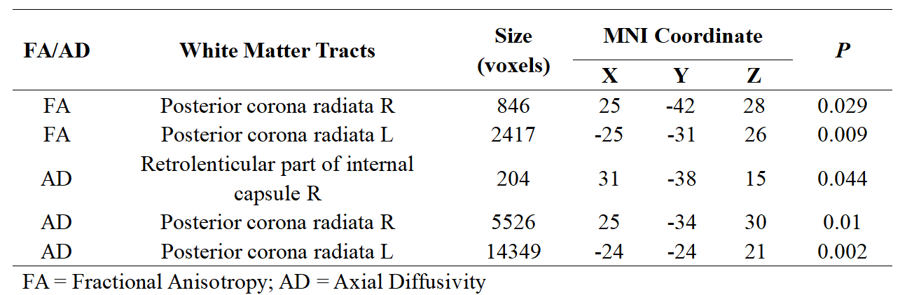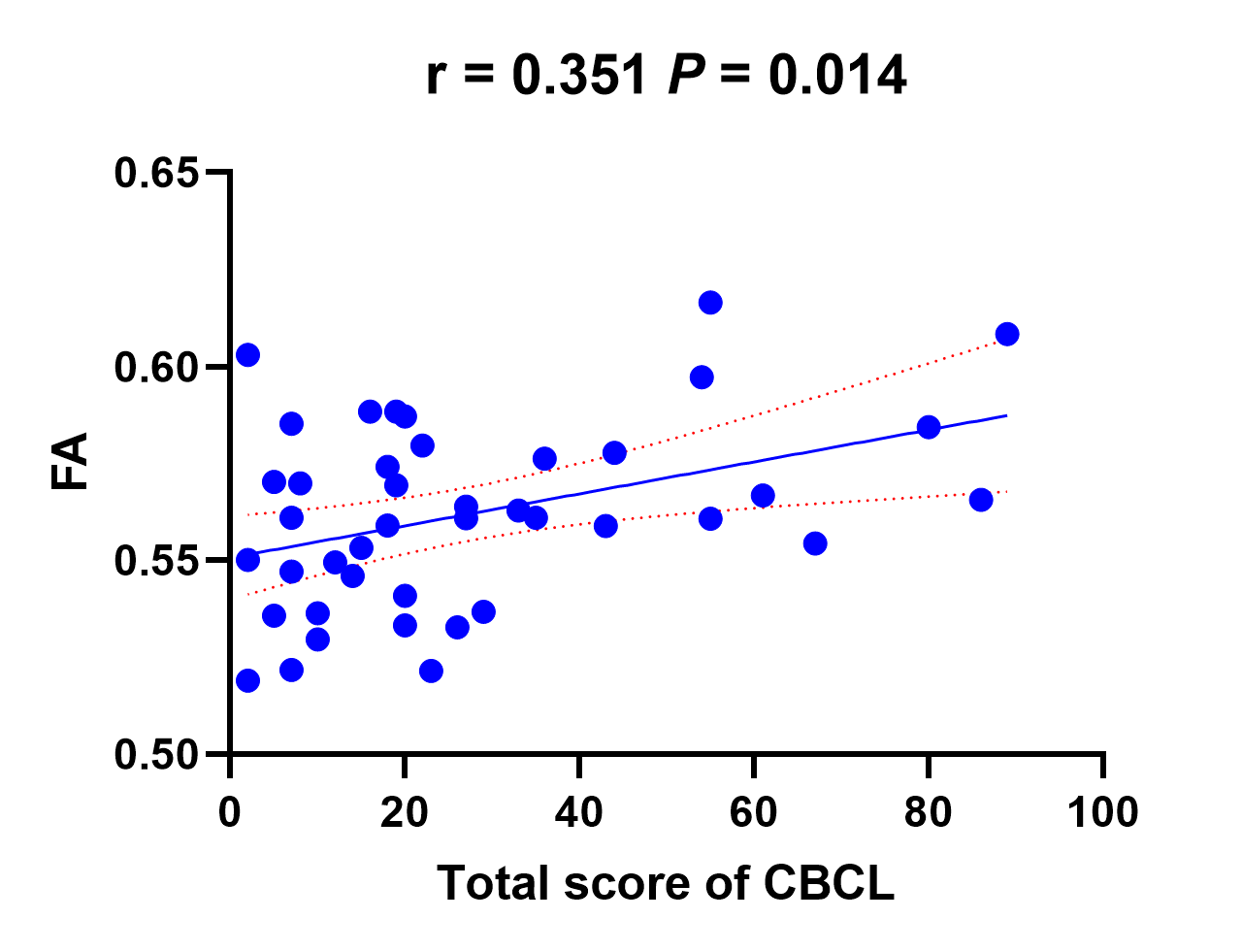 In the TBSS analysis, the IGHD group showed increased fractional anisotropy (FA) values (mainly in bilateral posterior corona radiata) and increased axial diffusivity (AD) values (mainly in 3 fibers: right retrolenticular part of internal capsule and bilateral posterior corona radiata) (P < 0.05, TFCE corrected) (Table 1, Fig. 1). However, there were no significant differences in RD and MD values. Total score of CBCL were positively associated with FA values in the cluster of left posterior corona radiata (r=0.351 P=0.014) (Fig. 2).Discussion