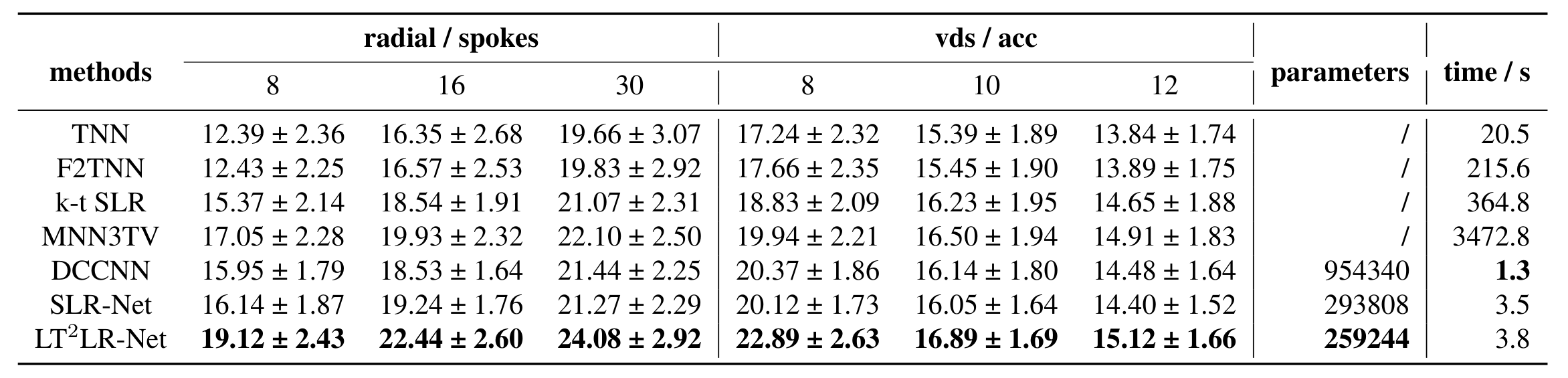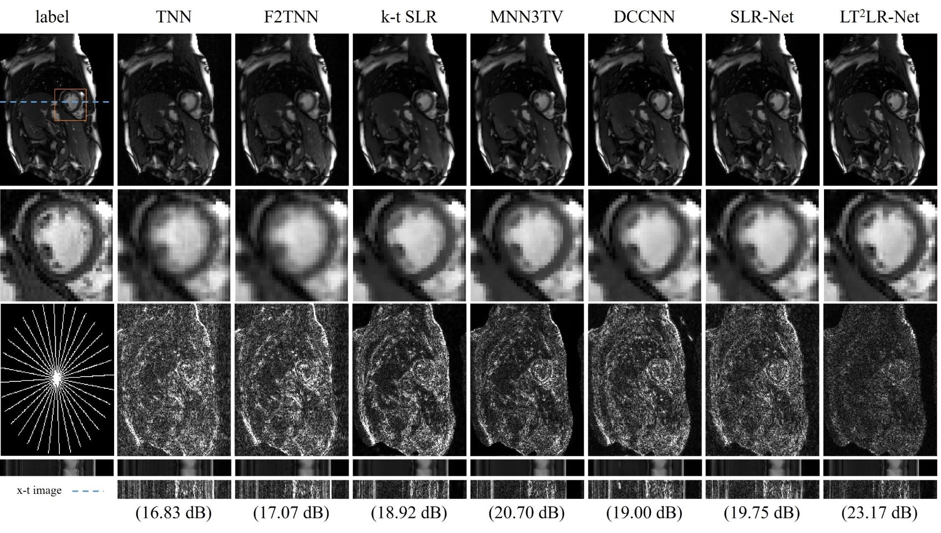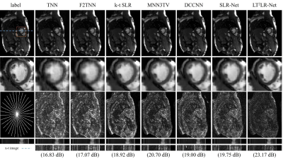 The reconstruction results are shown in Fig.2, where the pseudo-radial under-sampling pattern12 with 16 spokes is adopted, yielding the acceleration factor (acc) of around 10. It is observed that the reconstructed image by the proposed LT$$$^2$$$LR-Net retains the most image details and preserves the sharpest image edges compared with the other methods. In addition, the error maps show that the reconstruction performance of TLR-Net is significantly improved over the iterative methods and the unrolling networks.