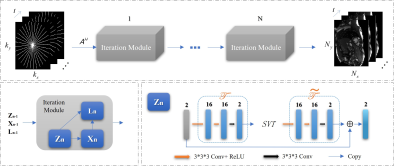 We then unfold the three substeps of the derived iterative algorithm into three corresponding blocks of the proposed LT$$$^2$$$LR-Net, i.e., the transformed low-rank tensor prior block $$$\mathbf{Z}_n$$$, the reconstruction block $$$\mathbf{X}_n$$$, and the multiplier update block $$$\mathbf{L}_n$$$. The framework of LT$$$^2$$$LR-Net is shown in Fig.1. We denote the three blocks as one iteration module corresponding to one iteration of the iterative ADMM algorithm.