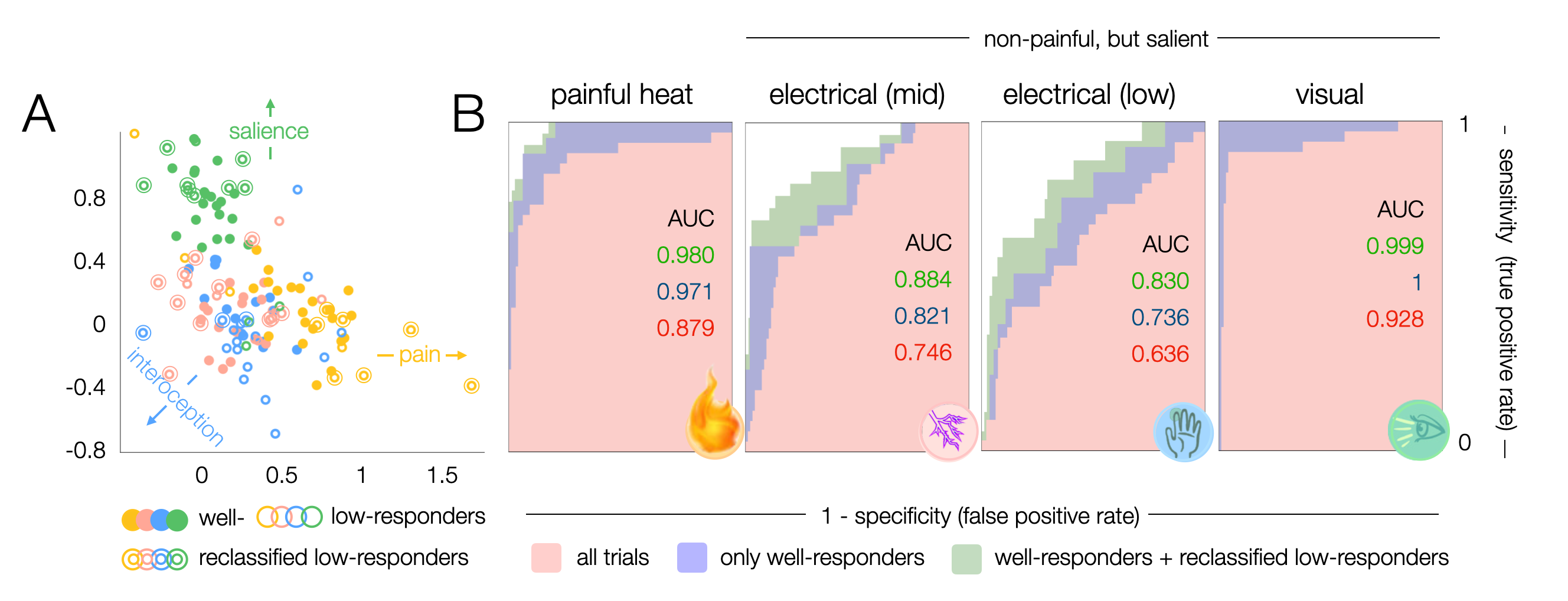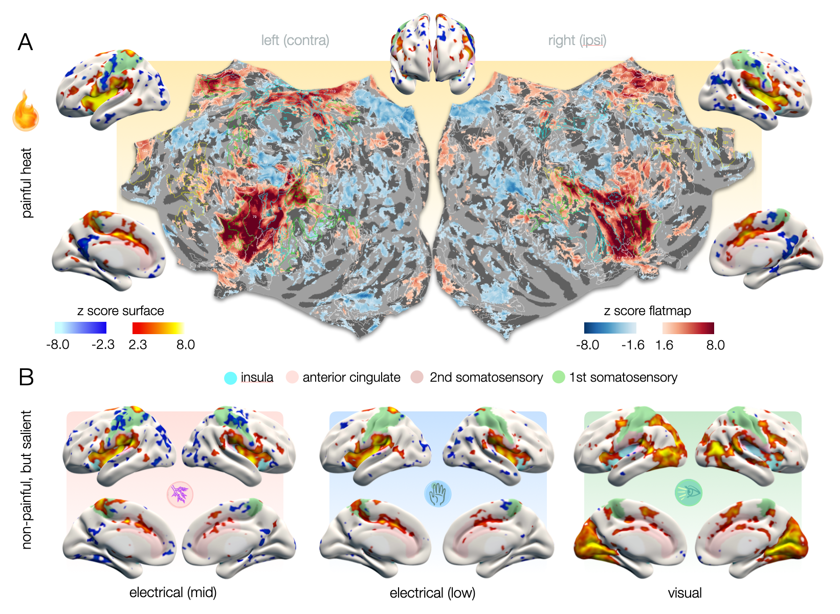To disentangle representations that are specific to pain from domain-general patterns, we applied brief painful heat versus non-painful salient (i.e., attention gabbing) control stimuli, including electrical stimuli of two intensities (mid and low) and flashes of light. The cortical representations we observed for all stimuli strongly overlap in domain-general regions (Fig. 1). The patterns were highly bilateral with the exception of the contralateral S1 for cutaneous stimuli which was not activated in response to visual stimuli. Visual stimuli exhibited no activation in the posterior insula, which was prominently activated in response to electrical stimuli and especially heat pain (Fig. 1B).