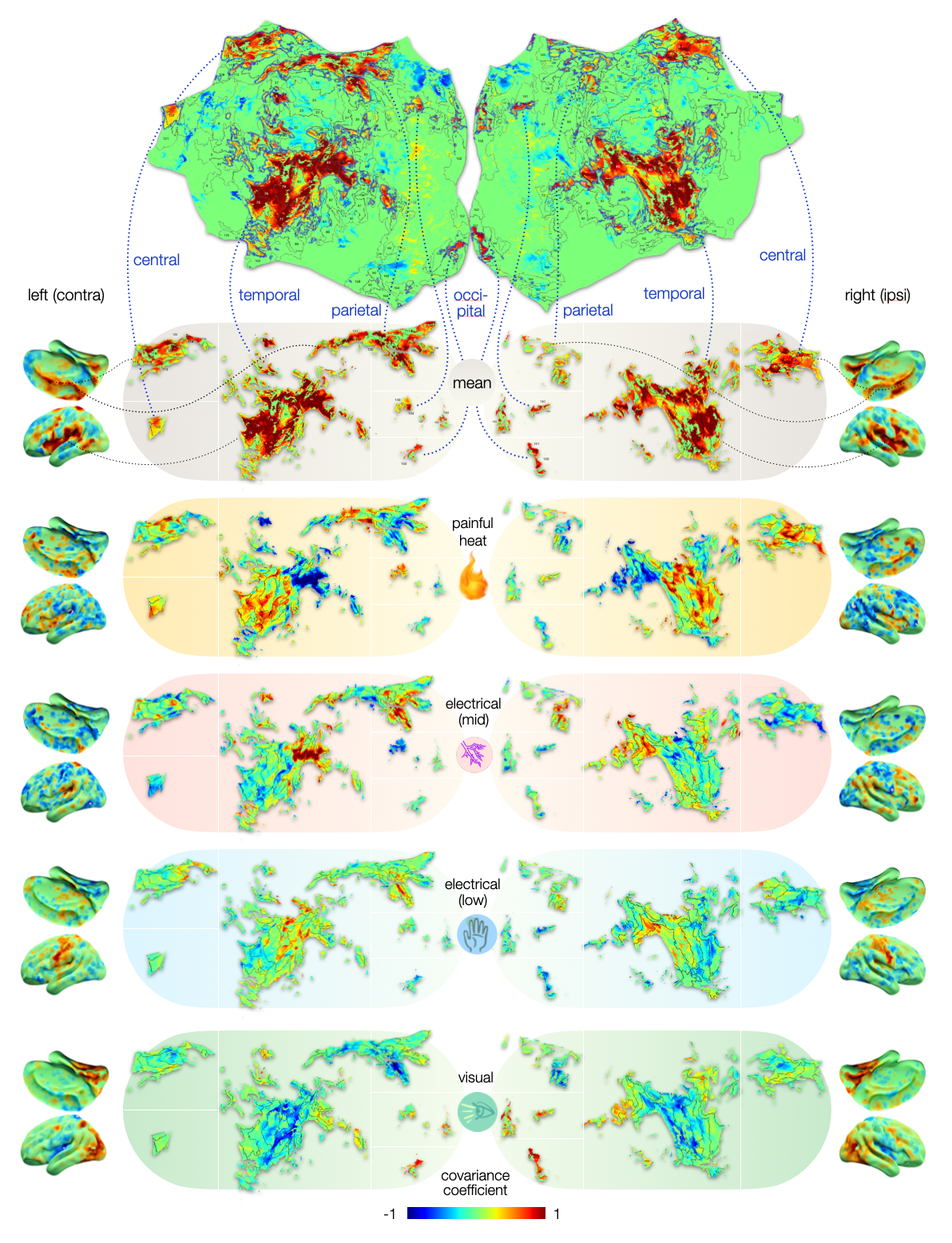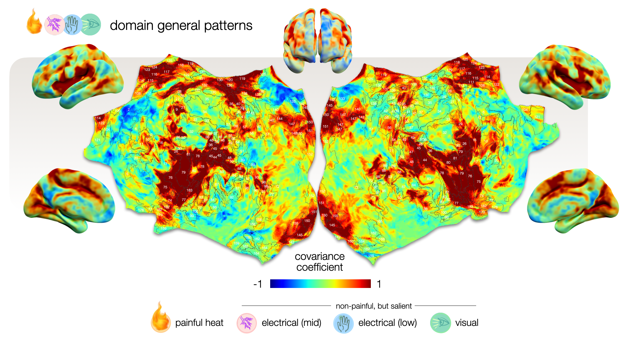 Comparing covariance coefficients of painful heat with non-painful electrical stimulation reveals that although both conditions share domain-general patterns, the weighting of these patterns (i.e., how they vary from the offset) differs. This is particularly true in some areas – such as the insular (74-78) and opercular regions (42-48), where the weighting is even reversed.