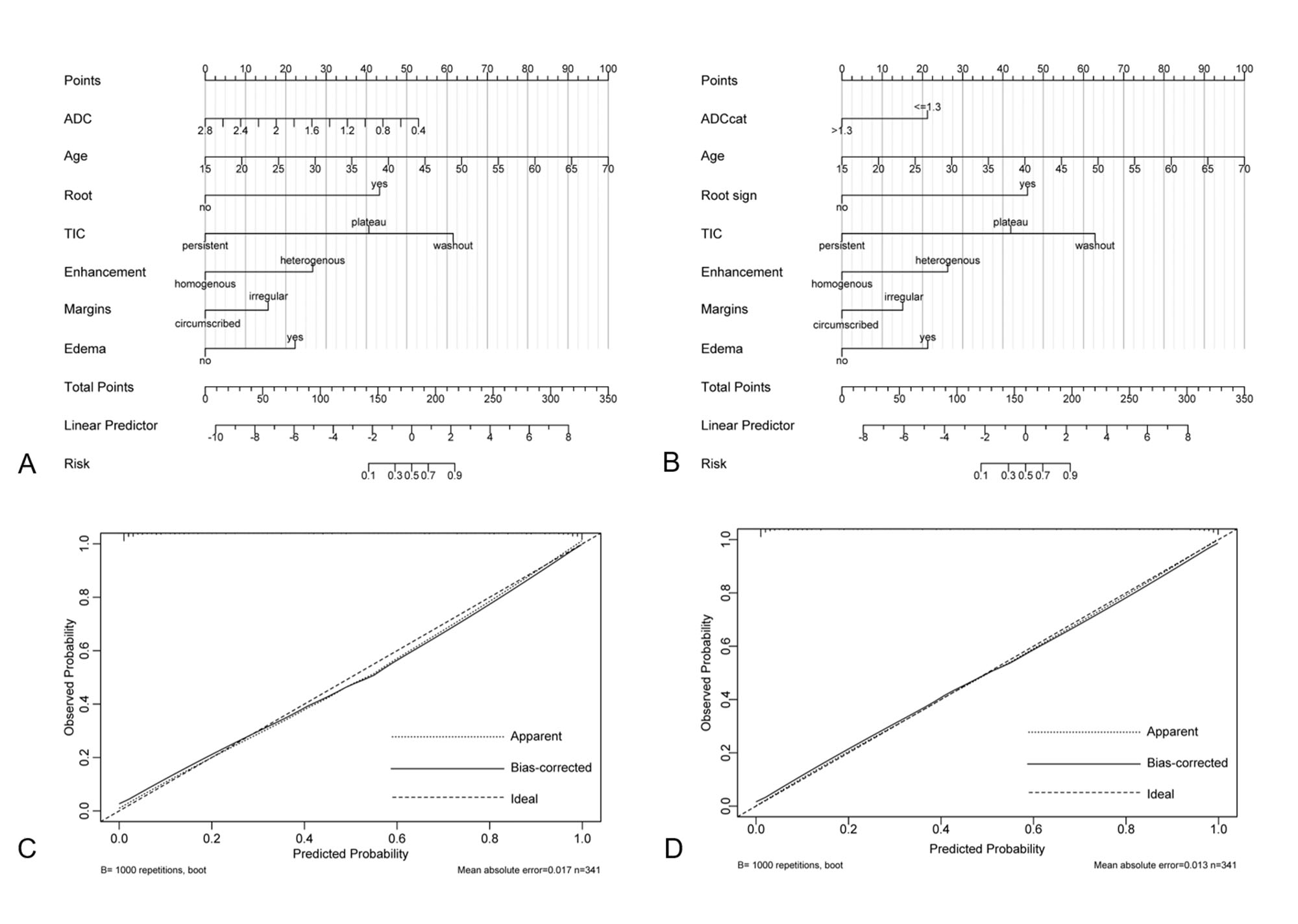 lesions (161 malignant and 180 benign) were included. Clinical data and imaging