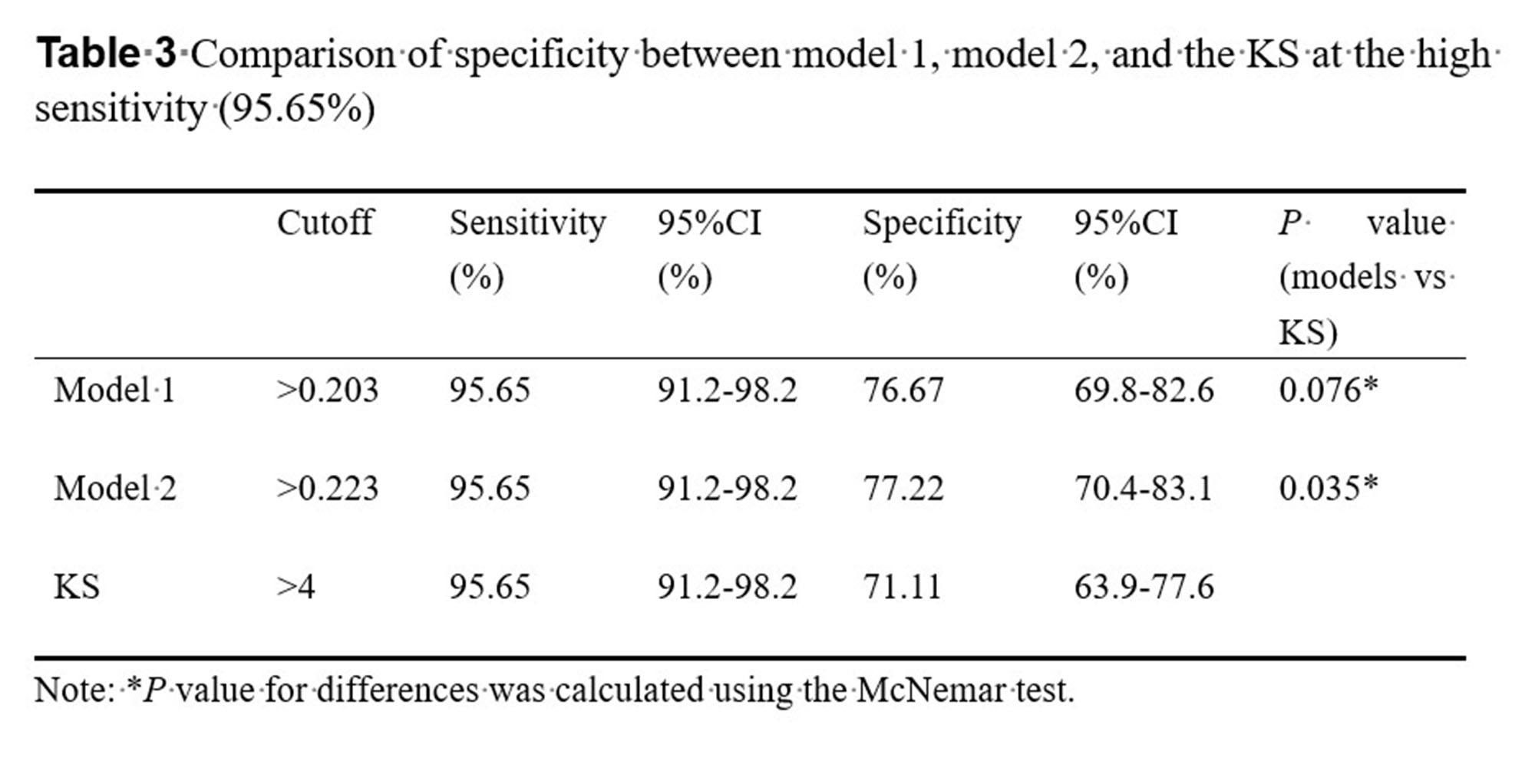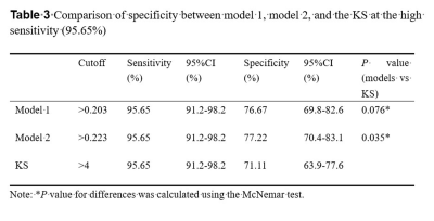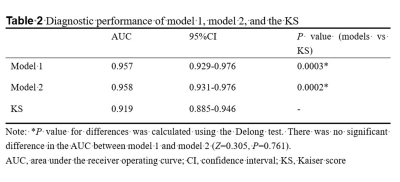 AUCs of our two models were significantly higher than that of the KS (0.957 vs.