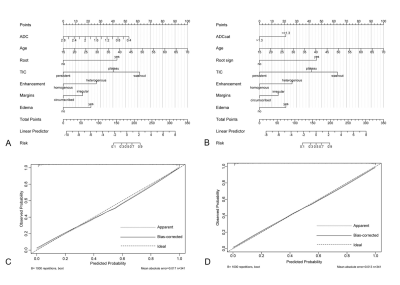 continuous or classified into binary form with a cutoff value of 1.3×10-3mm2/s was combined with other independent predictors to construct two nomograms,