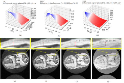 the TR and TE dependence of the signal intensity difference between different tissues at each flip angle (FA), determined the
