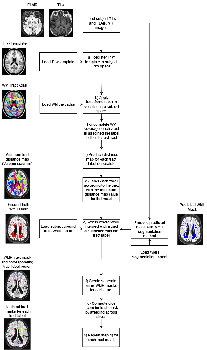The proposed framework takes MR images of a subject (T1w and FLAIR), the corresponding ground-truth WMH segmentation, and the WMH segmentation to be evaluated as inputs to produce performance metric reports across WM tracts (Figure 1). The framework is designed to avoid the need for diffusion MRI data which is not routinely available. The XTRACT atlas was used to provide the WM tract mappings [11].