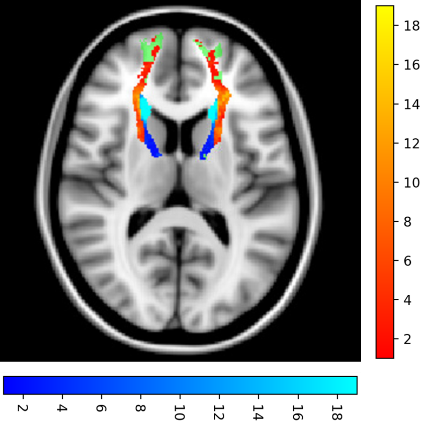 First the XTRACT template T1w image [11] is registered to the subject T1w input using nearest neighbour interpolation. The transformations are stored and applied to the XTRACT atlas to align it with the subject MR images. To ensure complete WM coverage after registration, we assume white matter voxels outside any tract boundaries should be assigned to the nearest tract. This was achieved by computing a multi-channel distance map for each tract. Voxels were labelled by tract using this distance map to select the channel with the minimum distance value for each voxel.