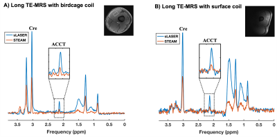 sLASER provides high SNR which enabled the accurate quantification of physiologically low ACCT concentrations at rest in all volunteers with both RF coils. In combination with sLASER, a surface coil can be used and ACCT can also be determined in the upper leg in overweight and obese volunteers. The high SNR of sLASER together with the use of UHF is also beneficial to detect dynamic changes of ACCT, for example after exercise. Acknowledgements