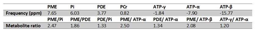 Image Acquisition and Analysis: All volunteers were examined in the supine position. Several vitamin E capsules were placed on the subject’s back for localizing the kidneys and were then scanned using proton imaging with SShTSE. A 31P surface coil with a diameter of 14 cm was placed underneath the kidney using proton imaging and signal from Vitamin E as reference. Single voxel (typical size of 40 (AP) x 40 (LR) x 60 (FH) mm3) spectra were acquired using ISIS sequence (TR=2500 ms, NSA=1024, sample points=2048, spectral bandwidth=3000 Hz, scan time=45 mins). The acquired spectra were processed with jMRUI [2] software package with following steps: zero filling (4000 zeros), Lorentzian apodization (8 Hz), curve fitting with the AMARES algorithm [3]. The starting values were entered based on preprocessed spectrum and literature results with phosphomonoester (PME) at 7 ppm, inorganic phosphate (Pi) at 5.6 ppm, phosphodiester (PDE) at 3.1 ppm, phospho-creatinine (PCr) at 0.3 ppm, adenosine triphosphate-γ (ATP-γ) at -2.3 ppm, ATP- α at -7.4 ppm and ATP-β at -15.7 ppm. AMARES algorithm calculated the final intensities and positions of the individual peaks. For further evaluation, the following metabolite ratios were calculated based on their areas under the curve (AUC): PME/ Pi, PME/PDE, PDE/Pi, PME/ATP-α, PDE/ATP-α, PME/ATP-β, and ATP-γ/ATP-α.Results and Discussion