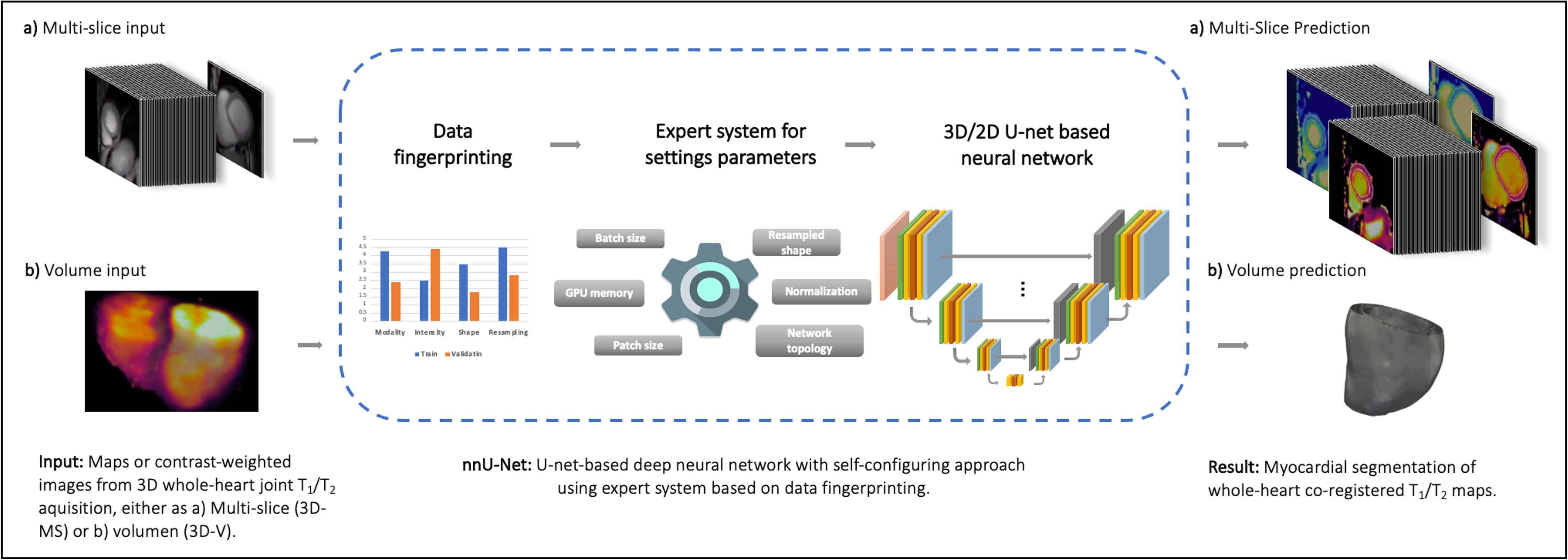 The proposed deep learning based approach consists of an nnU-Net5 which is trained to receive as input T1 maps, T2 maps, T1-weighted images or T2-weighted images indistinctively, in the format of either 2D slices or 3D volumes (Figure 1). The main advantage of this network based on a U-net is the self-configuring architecture and the setting of hyperparameters in relation to the input data. The network has been trained from scratch on training and testing data, which contain a set of multiparametric 1x1x2 mm3 3D whole-heart joint T1/T2 maps and corresponding T1/T2 contrast-weighted images of N = 34 subjects with suspected cardiovascular disease, in a training/testing ratio 28/6. Each subject comprised four 3D volumes (i.e., T1 map, single T1-weighted image (highest myocardial-blood contrast), T2-map and single T2-weighted image), of ~40 slices each. Since the maps were inherently co-registered3, the ground-truth manual segmentation was generated only for one volume per subject, annotated in the short-axis orientation by an experienced clinical reader. These annotations were extended to the three remaining volumes. Each slice took approximately 45s to be segmented by the expert, and ~1250 slices were segmented in total. All scans were acquired on a 1.5T scanner (MAGNETOM Aera, Siemens Healthcare, Erlangen, Germany), written consent was obtained from all subjects and the study followed guidelines approved by the National Research Ethics Service. The nnU-Net was trained on both 3D slice-by-slice and 3D volume inputs, denoted as “3D-MS” and “3D-V” trainings, during 50 epochs and with an initial learning rate of 0.02. Since the manual annotations were generated slice-by-slice, the resulting annotated volumes presented discontinuities (see Figure 2) that could be hindering an optimal training, especially for the 3D-V case. Hence, the annotated masks were morphologically smoothed by a series of 3D morphological operations (dilatation, closing, opening and erosion) ensuring greater 3D connectivity between two adjacent slices, and the nnU-Net was trained again with these new smoothed “3D-MS-s” and “3D-V-s” datasets. Dice scores were computed on the testing dataset for all four trainings to compare manual segmentation against predicted masks results. Results