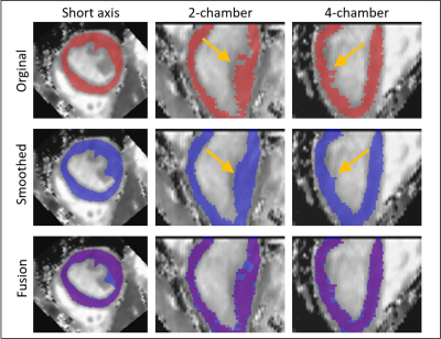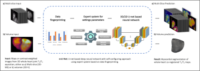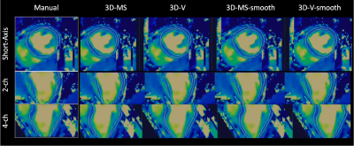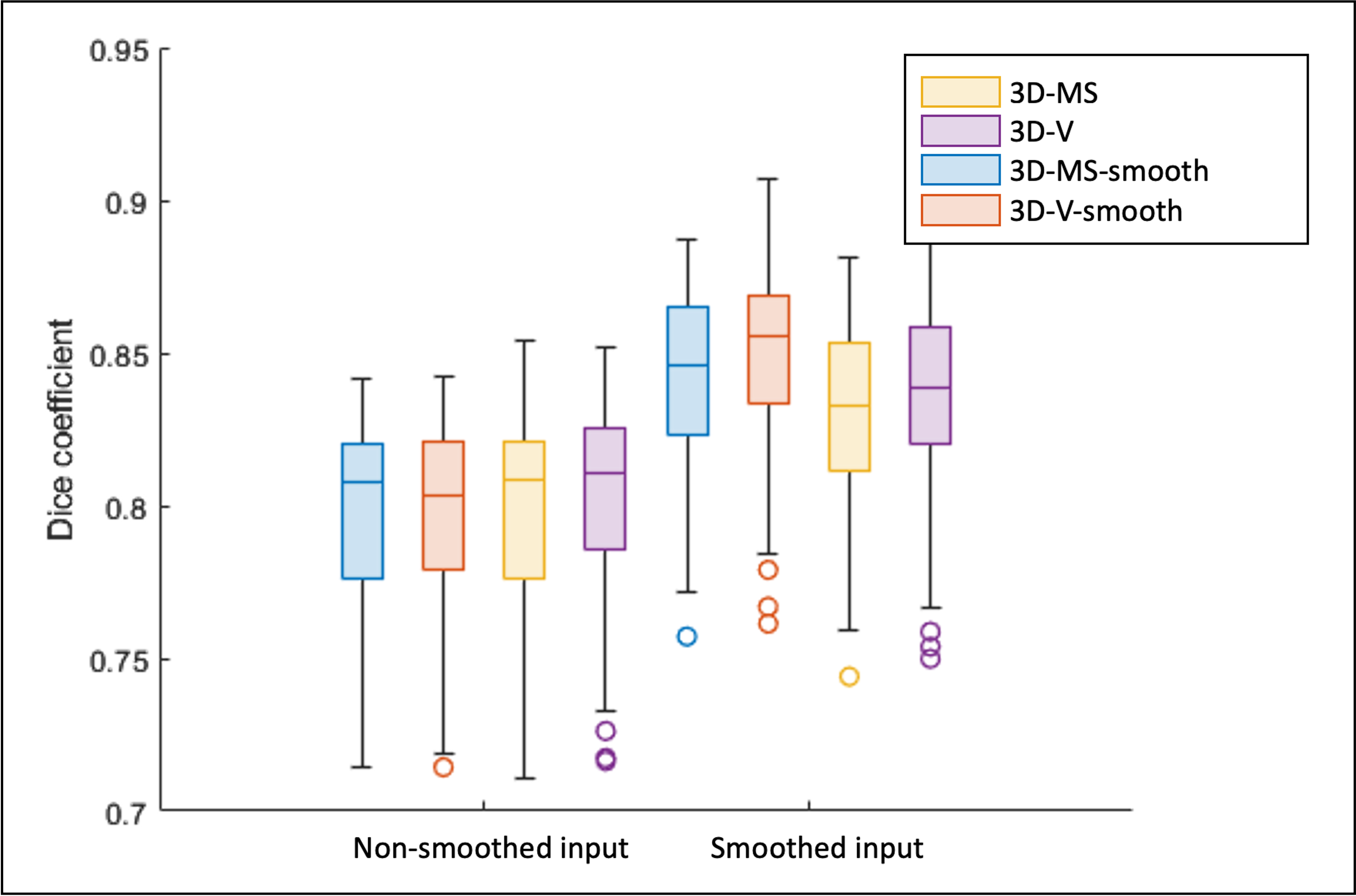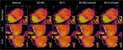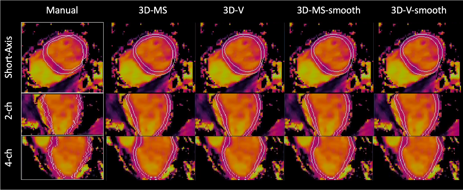 Figures 3 and 4 show predicted masks for T1 and T2 maps respectively at the short-axis mid-ventricular level, as well as in long-axis 2-chamber and 4-chamber for all 4 trainings. Dice scores of each trained network are shown in Figure 5. For the testing dataset, the best quantitative results in terms of Dice score were achieved after smoothing the input dataset, more specifically by using a smoothed 3D volume (3D-V-s). Segmentation time was ~45s per slice for manual segmentation vs. ~0.5s per slice for the proposed nnU-Net approach. Discussion