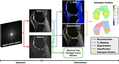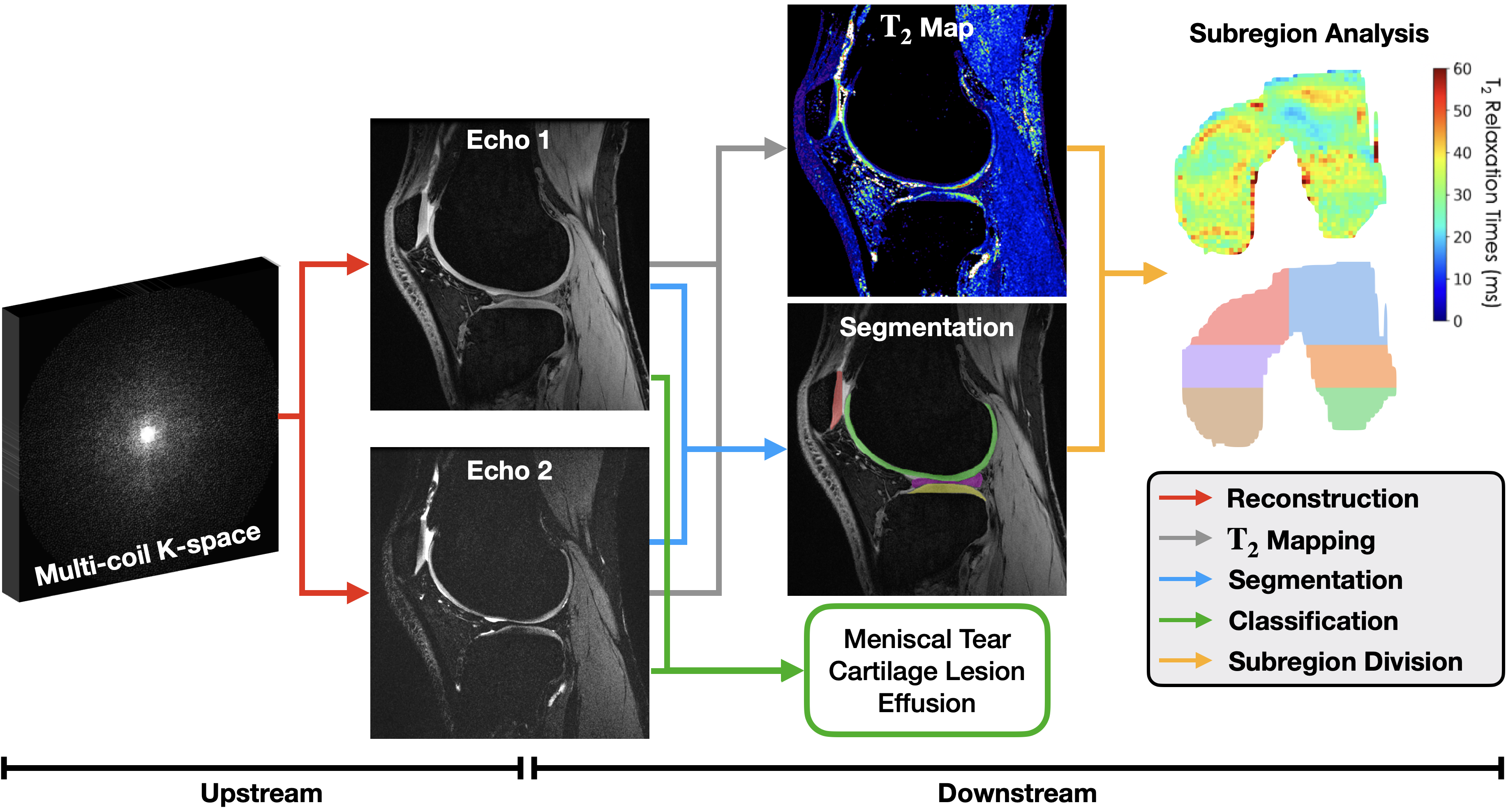 Fig.1: Overview of a quantitative knee MRI workflow for T2 estimation and pathology classification with quantitative double echo steady state (qDESS) scans. Multi-coil k-space for both echos are first reconstructed (red). Reconstructions are used to estimate pixelwise T2 maps (gray), segment tissues (blue), and classify pathology (green). T2 maps and segmentations are combined regional T2 estimates (orange). Changes in reconstruction processes can have a considerable impact on downstream classification, segmentation, and T2 performance.