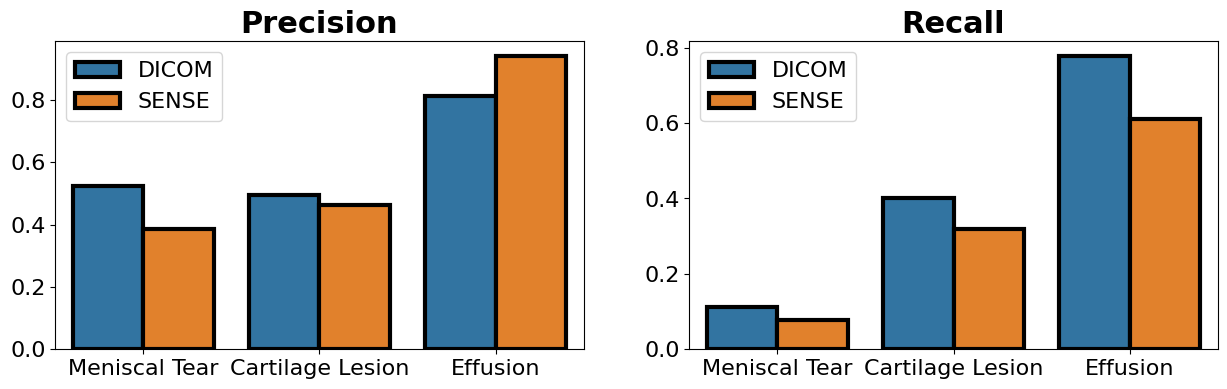 Fig.2: The effect of DICOM vs fully sampled SENSE reconstruction methods on the performance of the DICOM-trained classification model. Both DICOM and SENSE reconstruction methods use fully-sampled k-space. However, classification performance is worse on SENSE-based reconstructions. This may suggest vendor-specific DICOM postprocessing can cause data distribution shifts relative to standard SENSE-based reconstruction.